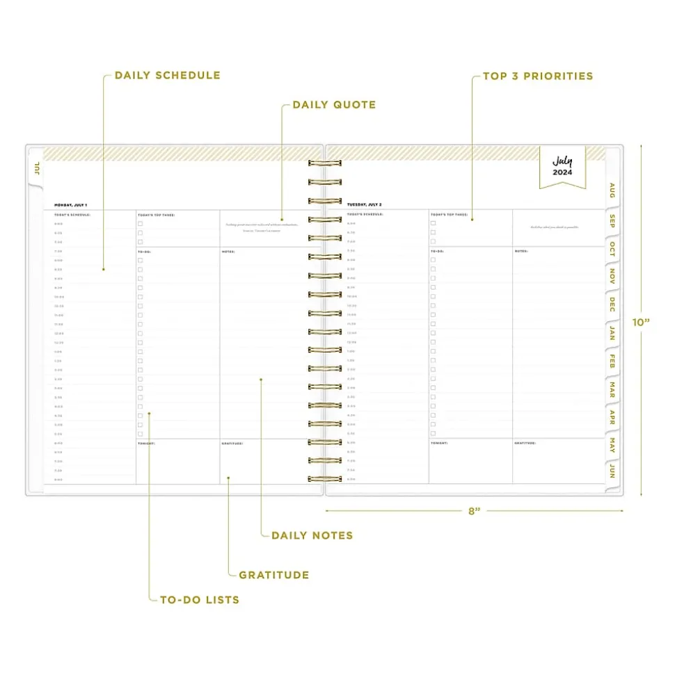 Design your year with Day Designer for Blue Sky academic planners. The Rugby Stripe 2024-2025 daily and monthly planner has hourly planning pages to manage a busy schedule and time-block activities. One page per weekday, and weekends appear on the same page. Includes tabbed monthly views, a storage pocket, stickers, and goal-setting pages.