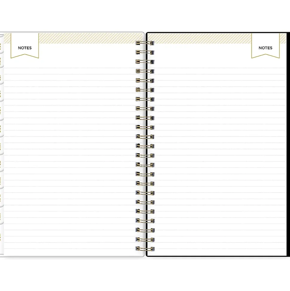 - Features one month per two pages and one week per two pages, with space for notes and quick reference calendars