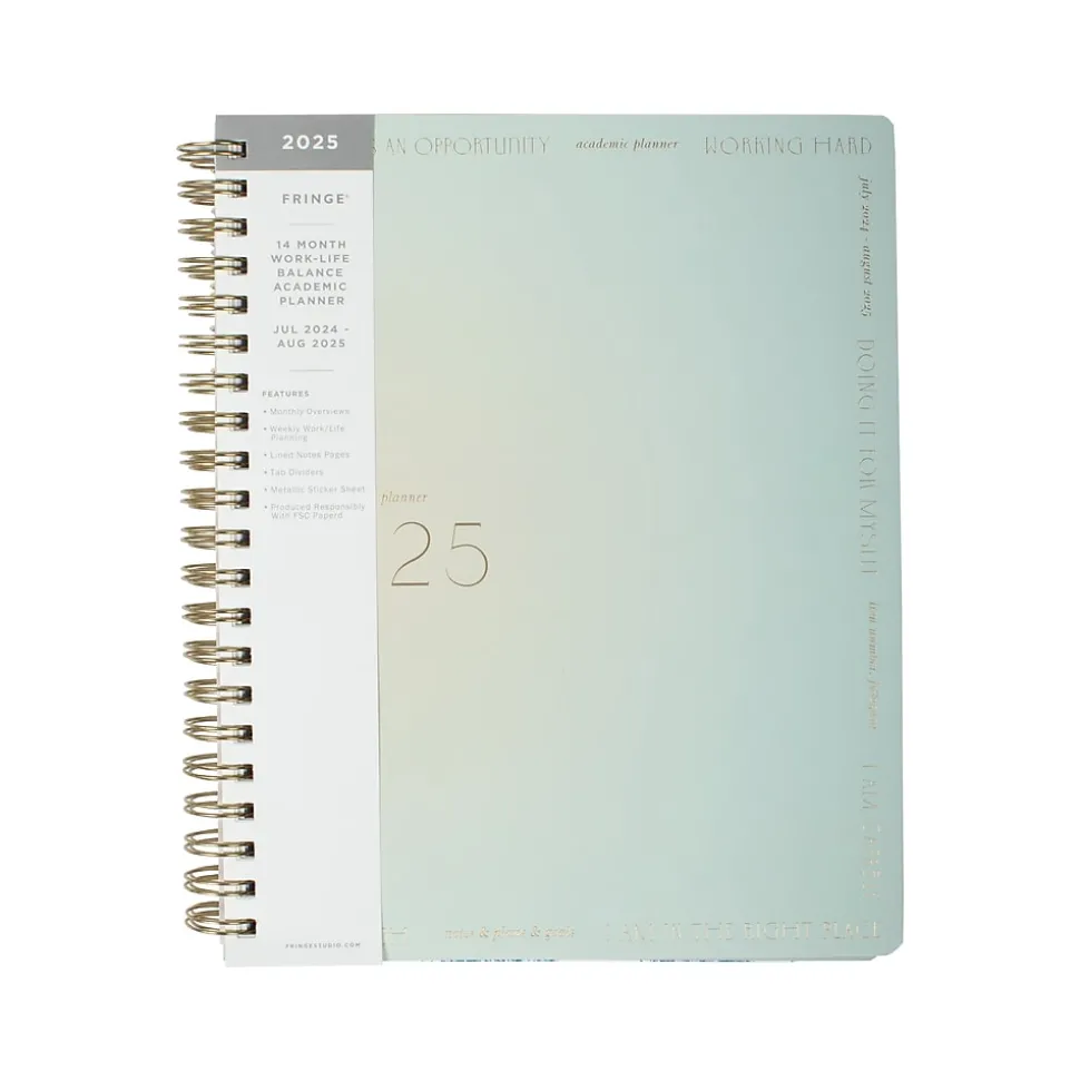 The Manifesting work-life balance planner from Fringe is a perfect way to stay organized from July 2024 through August 2025. This planner includes 14 color tab dividers for each month, and every month includes a full month view and weekly pages with plenty of room for notes and tracking important dates. The special work-life balance weekly grids allow you space to organize your work life and your personal life separately. This planner contains 180 pages and is printed on FSC paper.