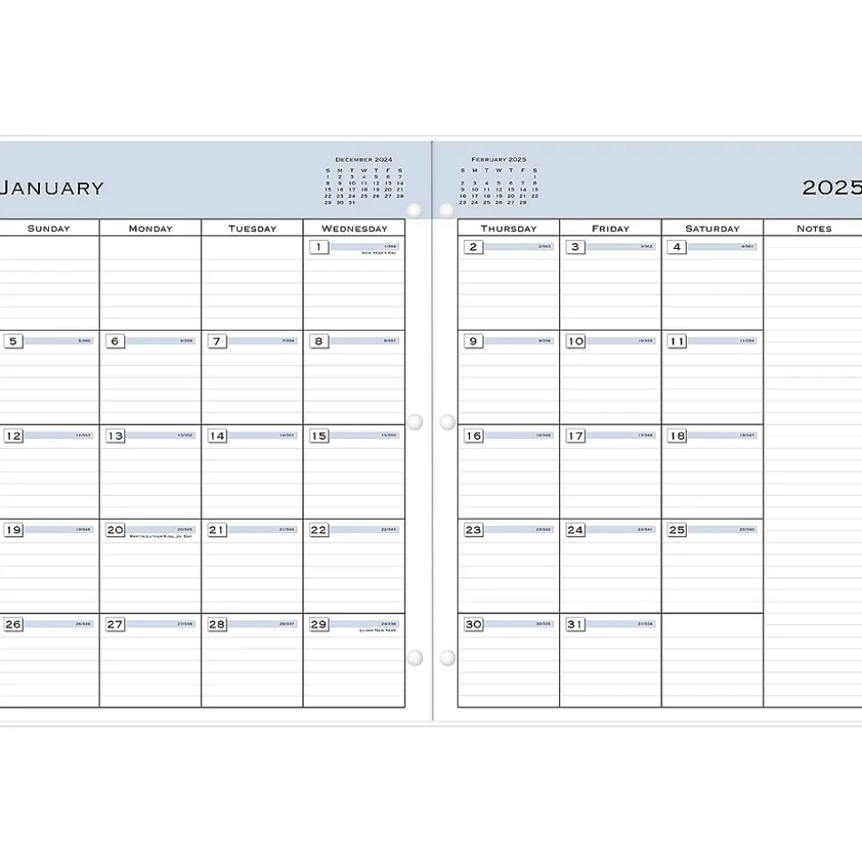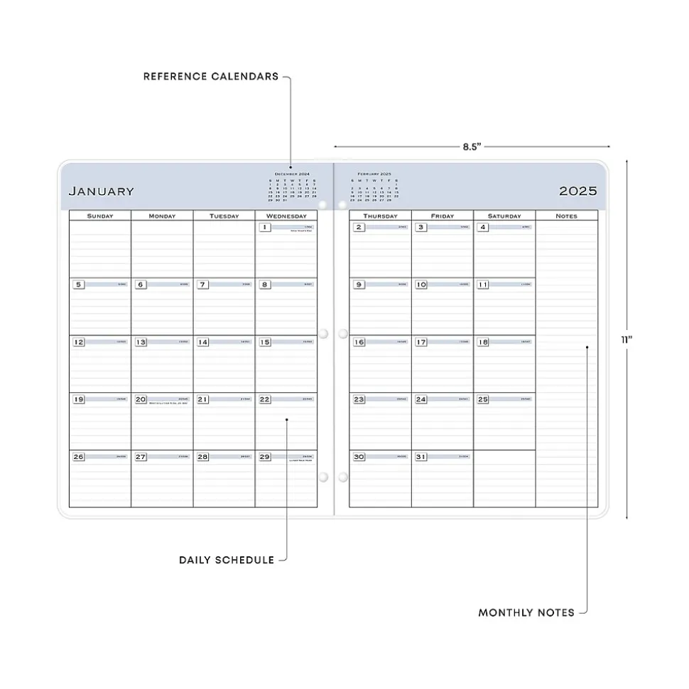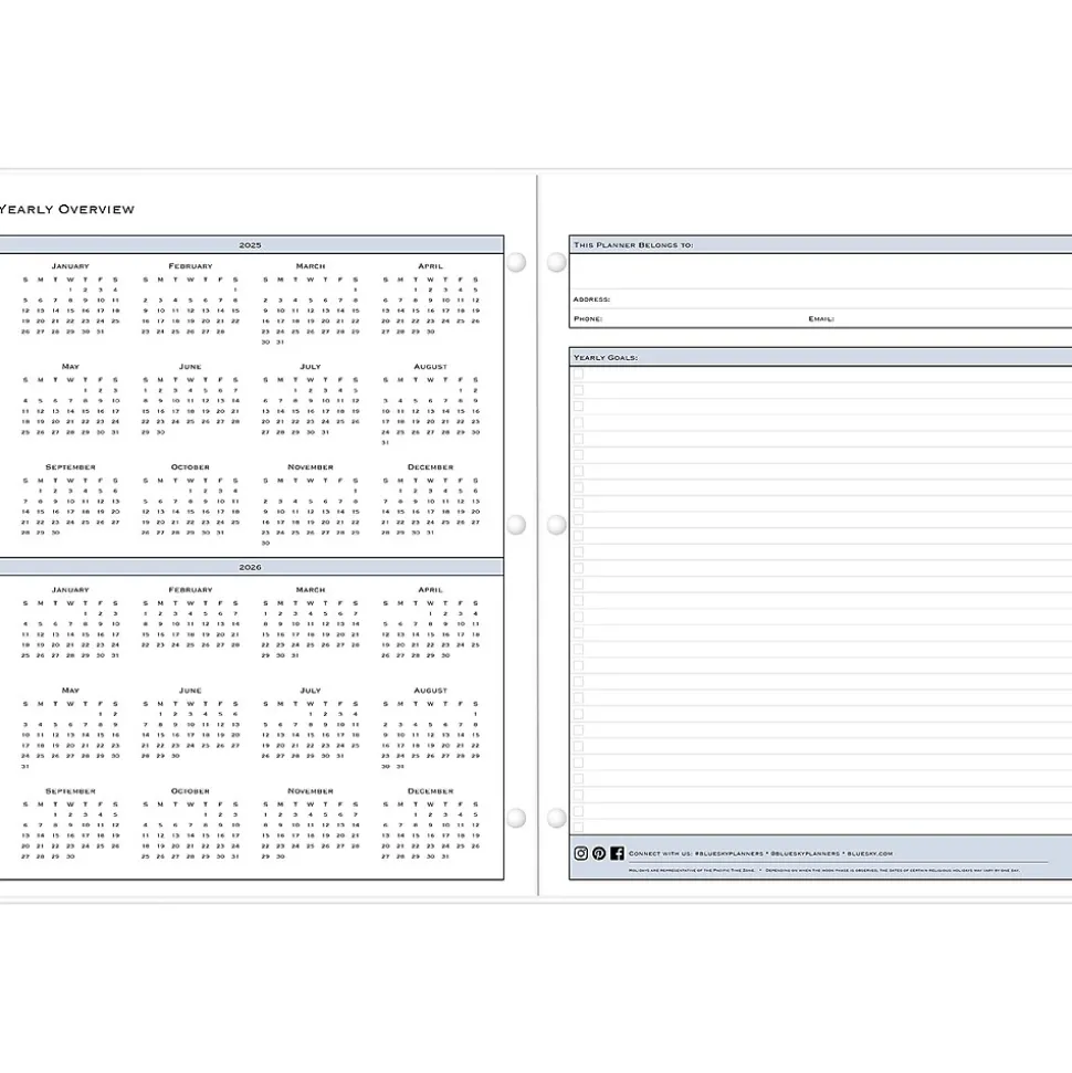 A simple planner with monthly calendars. Snap this 2025 monthly planner from Blue Sky into your binder or folder so you can access your appointments, tasks, and goals with ease. The planner has a light, flexible cover, stapled spine, and a three-hole punch for use with most full-size binders.
