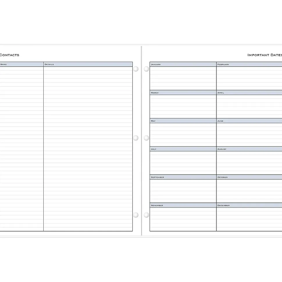 - Yearly overview, list of major holidays, pages for your contacts, goals, and important dates