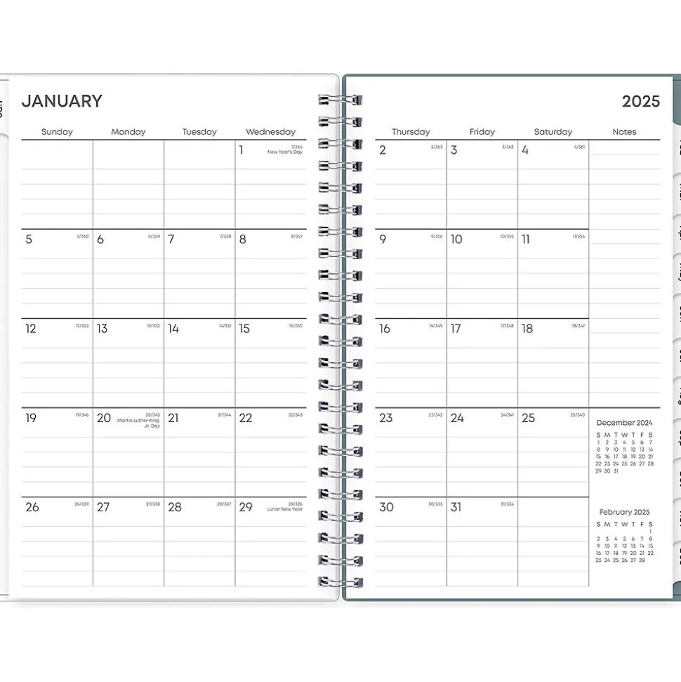 - Features one month per two pages and one week per two pages, with space for notes and quick reference calendars