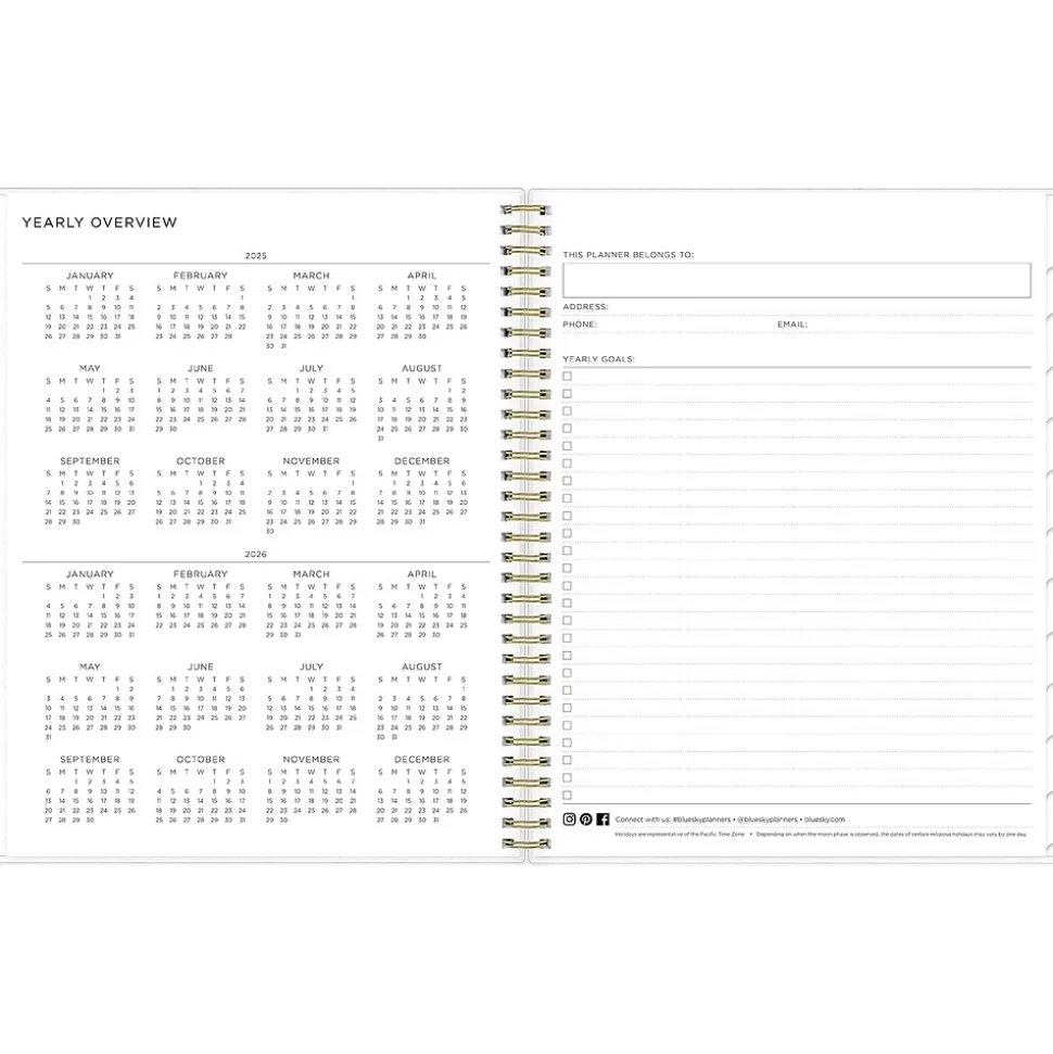 - Yearly overview, list of major holidays, and pages for your contacts, goals, important dates, and notes