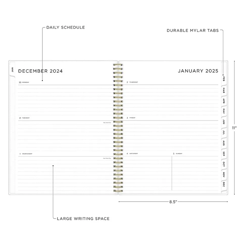- Features two-page weekly and monthly spreads, with space for notes and quick reference calendars