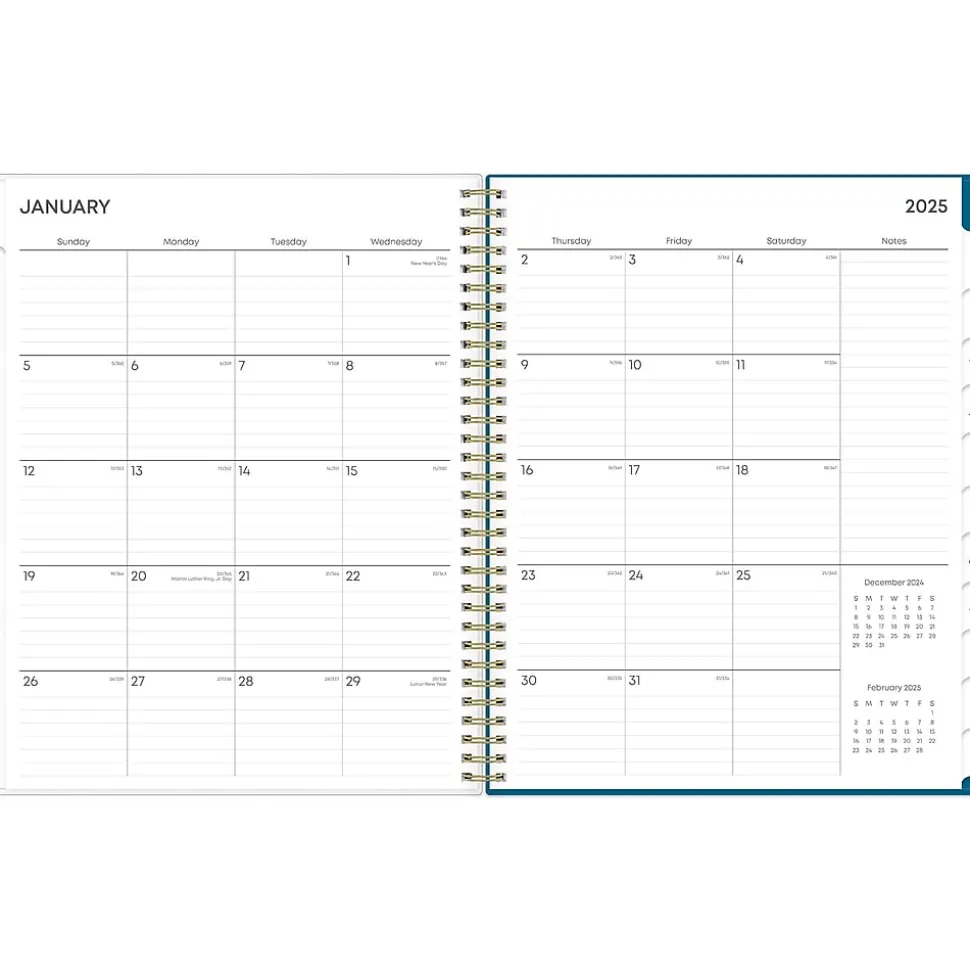 - Features one month per two pages and one week per two pages with space for notes and quick reference calendars