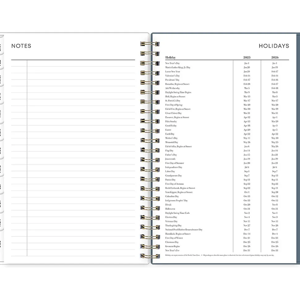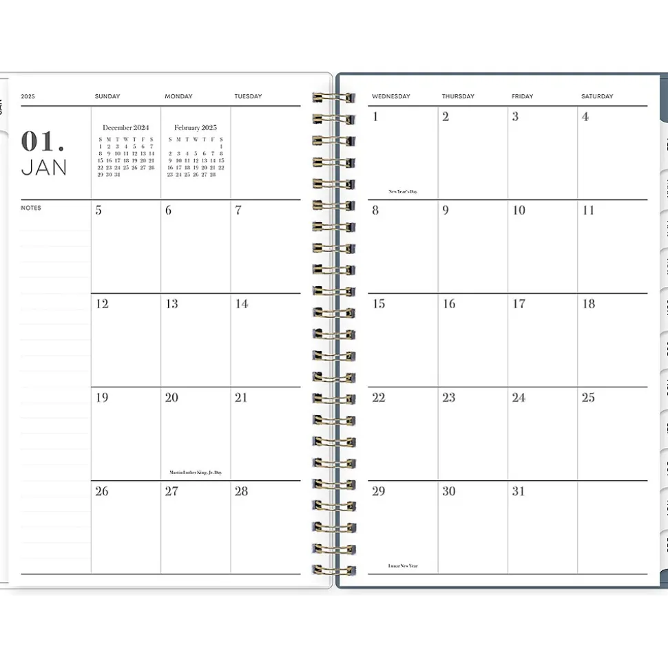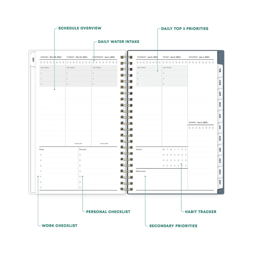 - Features two-page vertical appointment-style weekly and monthly spreads, with space for notes and quick reference calendars