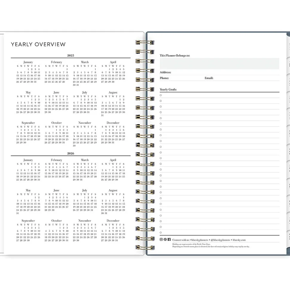 - Yearly overview, list of major holidays, and pages for your contacts, goals, important dates, and notes