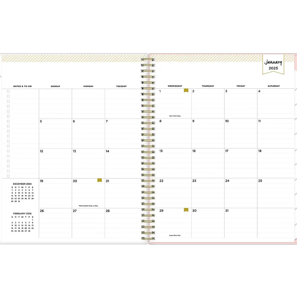 - Weekly and monthly planner covers 12 months from January 2025 to December 2025