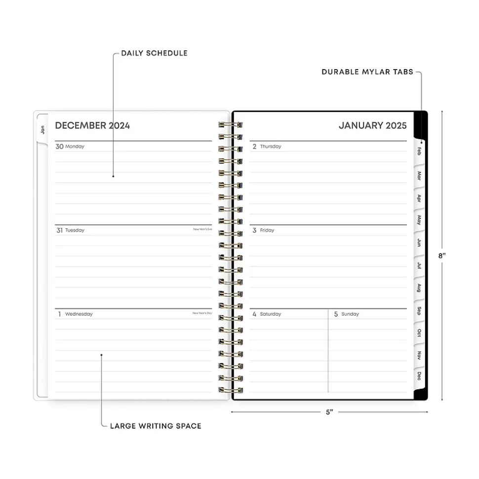 - Features two-page weekly and monthly spreads, with space for notes and quick reference calendars
