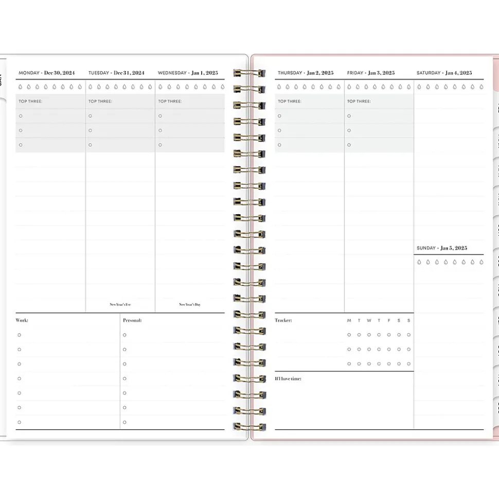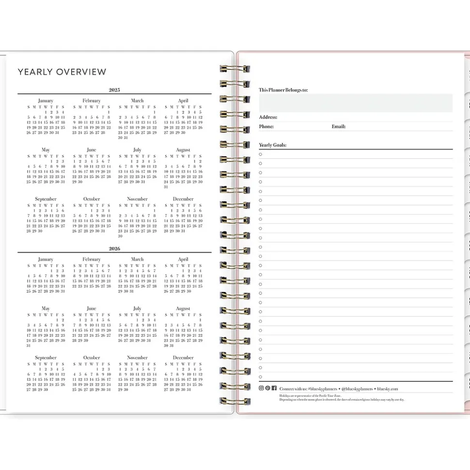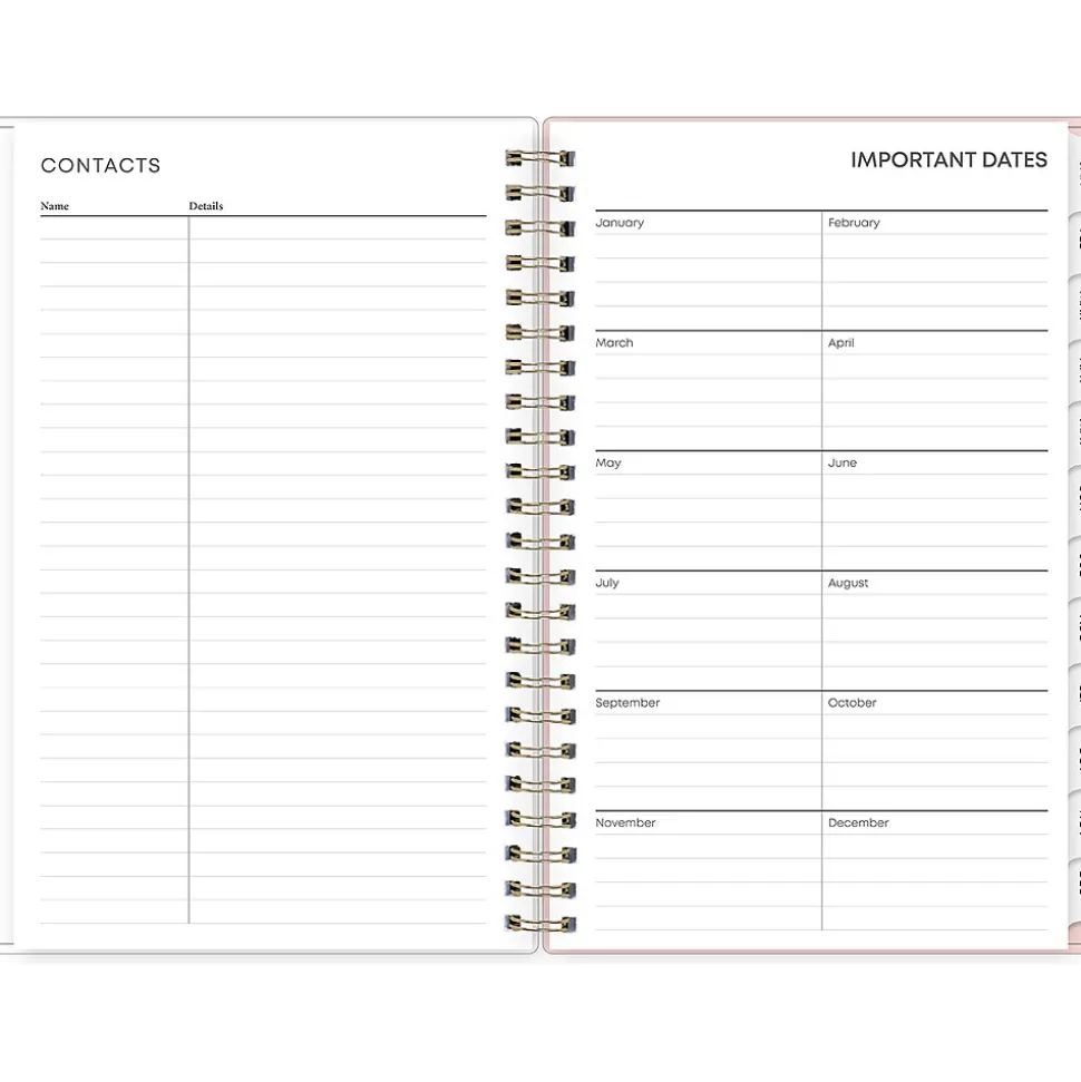 - Yearly overview, list of major holidays, and pages for your contacts, goals, important dates, and notes
