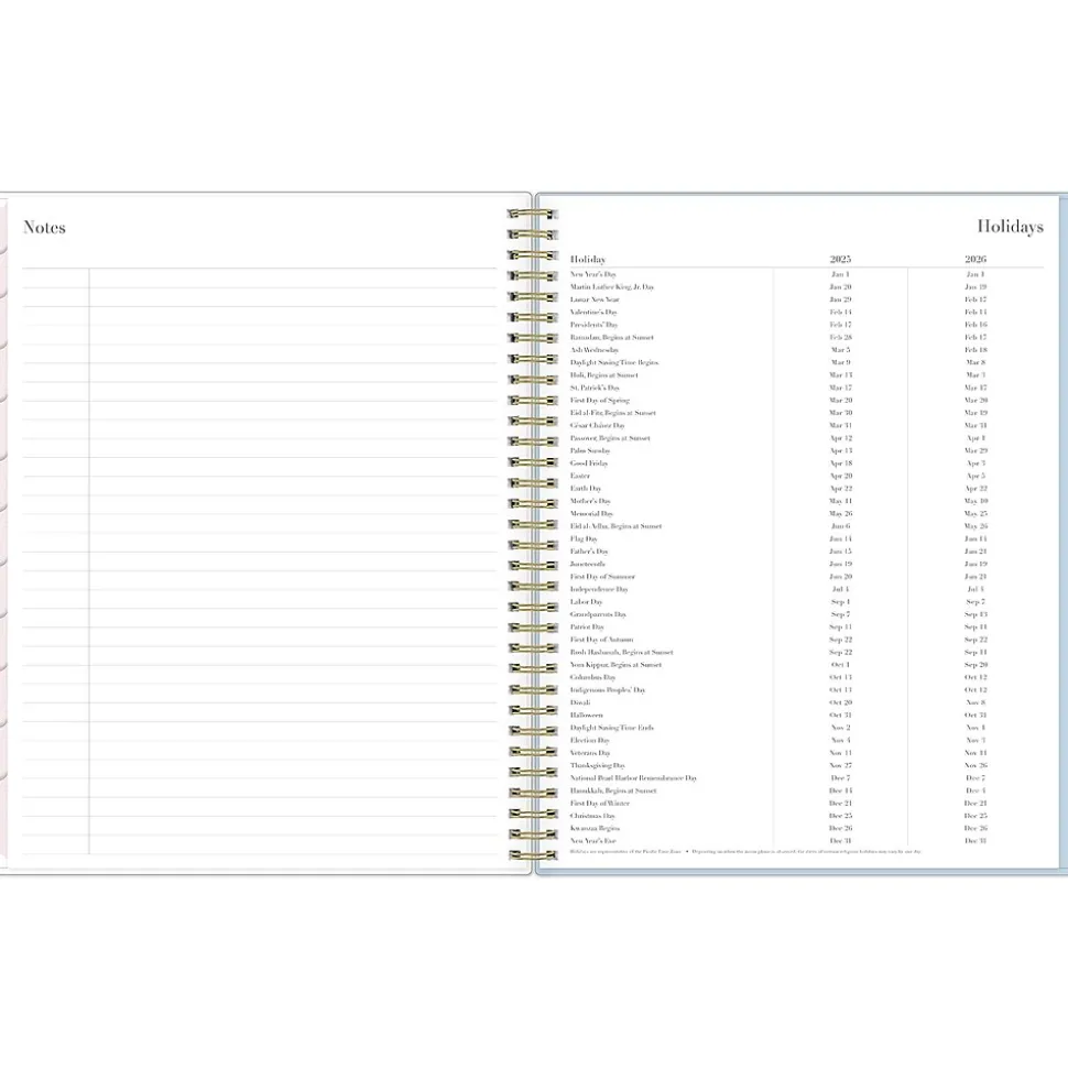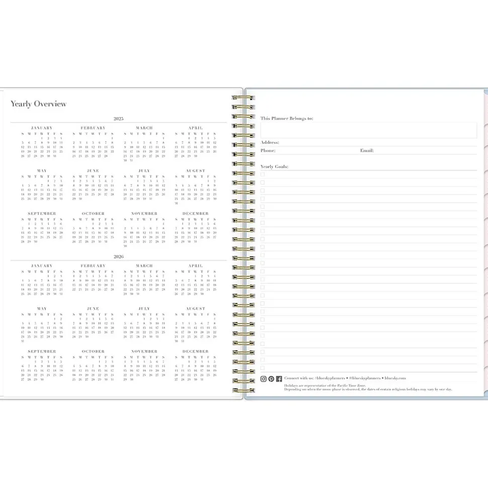 - Yearly overview, list of major holidays, and pages for your contacts, goals, important dates, and notes