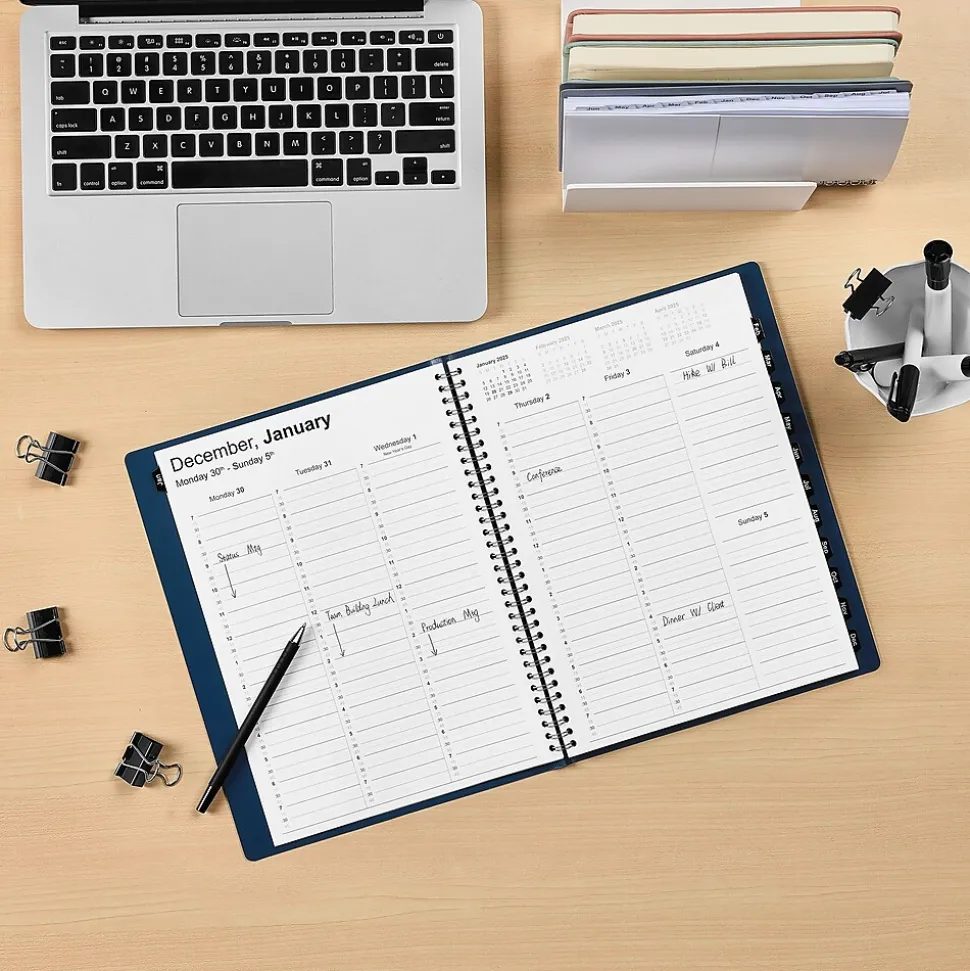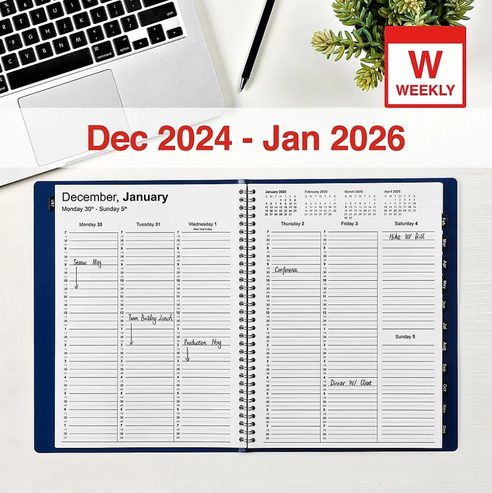 Organize your workday with this 2025 weekly appointment book. The leatherette cover protects against dust and damage, while the 14-month format helps you manage appointment times. This Staples 8 x 11-inch navy weekly appointment book features a spiral binding to make flipping through pages easy and a compact size for convenient storage in your desk or briefcase.