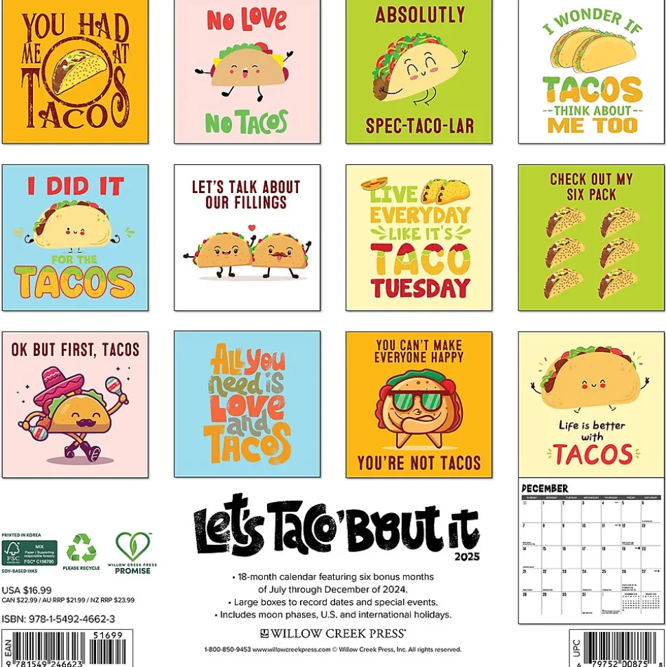 - THE PERFECT GIFT – Crunchy or corny, we can all agree that tacos and puns make everything better. The 2025 Let’s Taco ‘Bout It 12” x 12” Wall Calendar is the perfect gift for anyone looking to add zest to their wall.