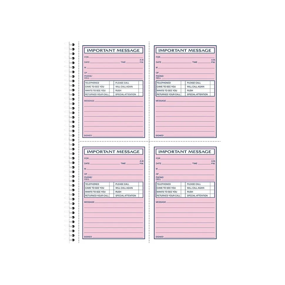 Make sure important information is recorded accurately with this Adams phone message book. Each convenient form features dedicated space for callback numbers, names, and reasons for calling. The two-part carbonless format makes it easy to archive copies of each call for future reference, and the spiral binding lets you quickly flip through previous pages. This Adams phone message book contains 200 form sets, providing an ample supply for busy reception desks.