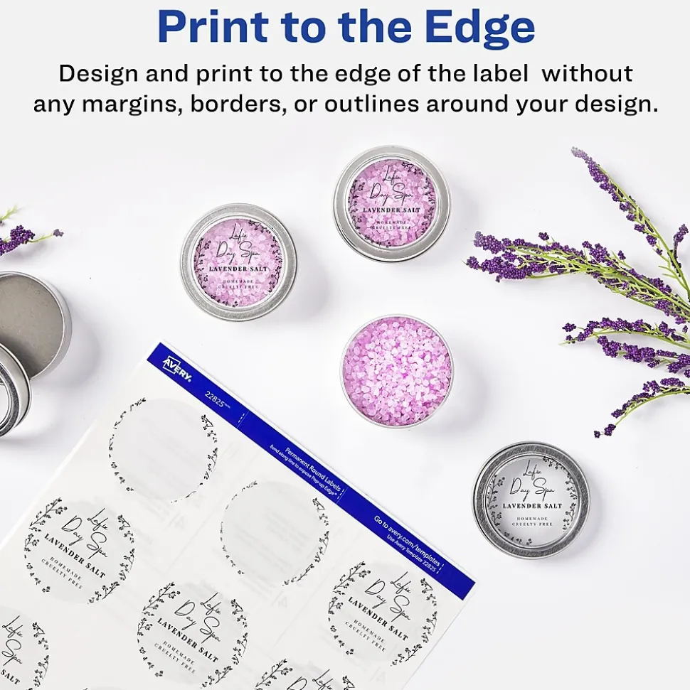 Give your product or handmade gift a custom printed on look with Avery crystal clear round labels, best when applied to white or light colored surfaces. Our print-to-the-edge capability allows you to create bright, eye-catching full-bleed labels with sharp text and crisp images printed right to the edge of the round sticker label with no border or margin. Each sheet of labels features Sure Feed(R) technology which helps deliver a more reliable feed through your printer to prevent print misalignments and paper jams. Our round printable stickers are quick and easy to apply with our patented Easy Peel label sheets with Pop-up Edge. Simply fold the sheet back to display the label edges for convenient and fast peeling that saves time and avoids label waste.A strong permanent adhesive is used to make sure that these labels stick and stay to paper, cardboard, plastic, glass, metal and more, without curling or falling off. Compatible with both laser and inkjet printers. Avery Design & Print makes it easy to create customized labels from your own home or business. The free browser-based software has everything you need to design pricing labels, planner stickers, gift label stickers, and labels for beauty products, essential oil, candles, soap and more. Try it out today at avery.com/templates. Try it out today at avery.com/templates.