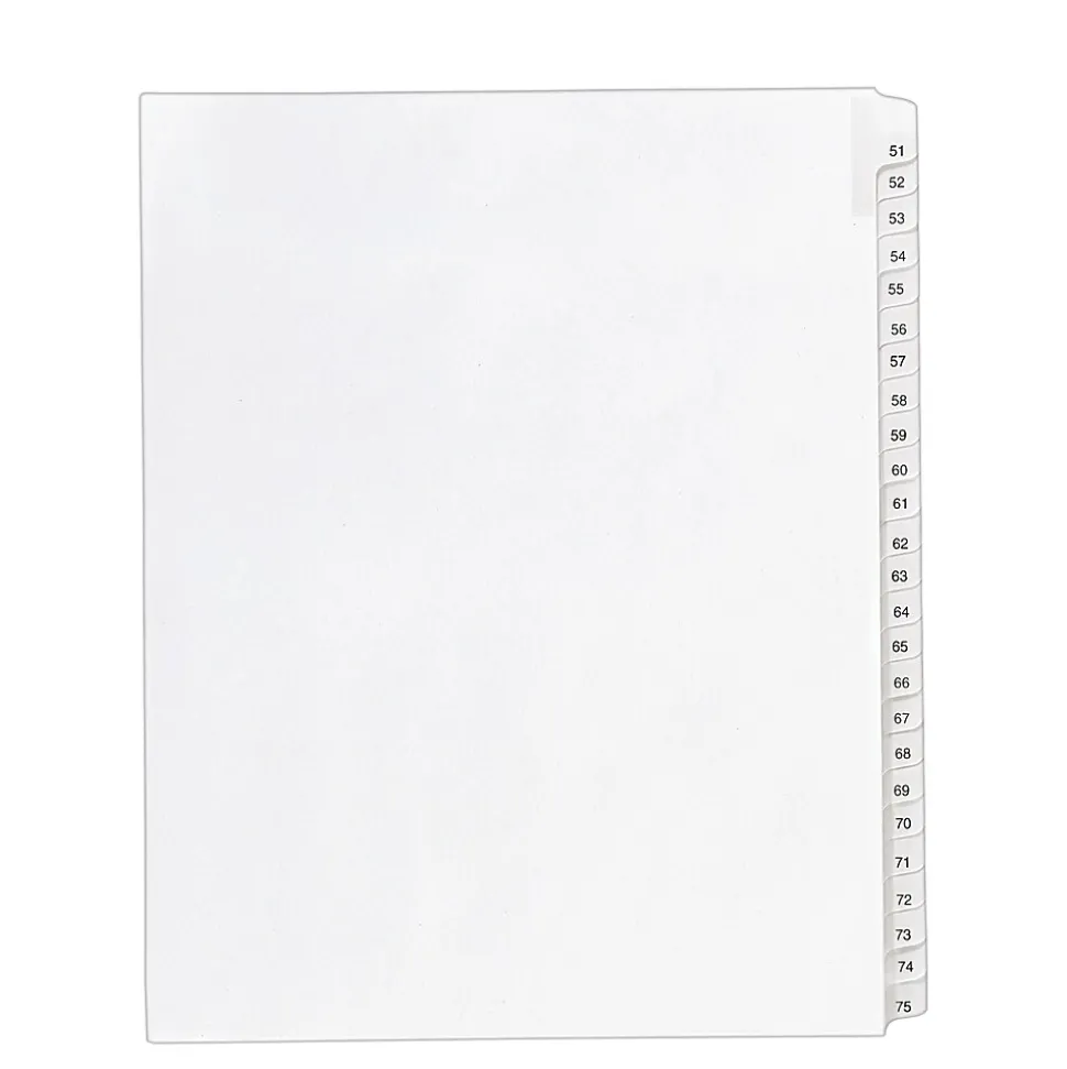 When you want disorganized files and unruly paperwork to cease and desist, turn to these Avery(R) Collated Legal Dividers – Allstate(R) Style featuring Tabs 51-75. Now you can bring order to index briefs, legal exhibits, mortgage documentation files, and more. Clear and durable Rip Proof(TM) reinforced tabs on white paper stock help you reference your documents with ease, and are conveniently preprinted on both sides using Helvetica regular type so you can find what you need in a flash. The binding edge is unpunched so they can fit practically any binding system, giving your files a clean and professional appearance. Your motion for clean and orderly files has been granted.