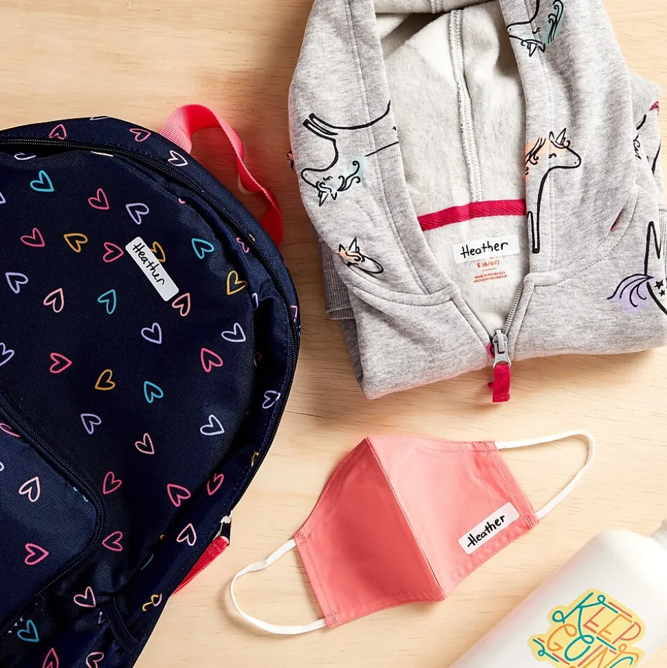 - Label stickers are backed with a permanent adhesive that can be applied to a wide range of smooth surfaces, including fabric, water bottles, luggage, school supplies and more with no iron required