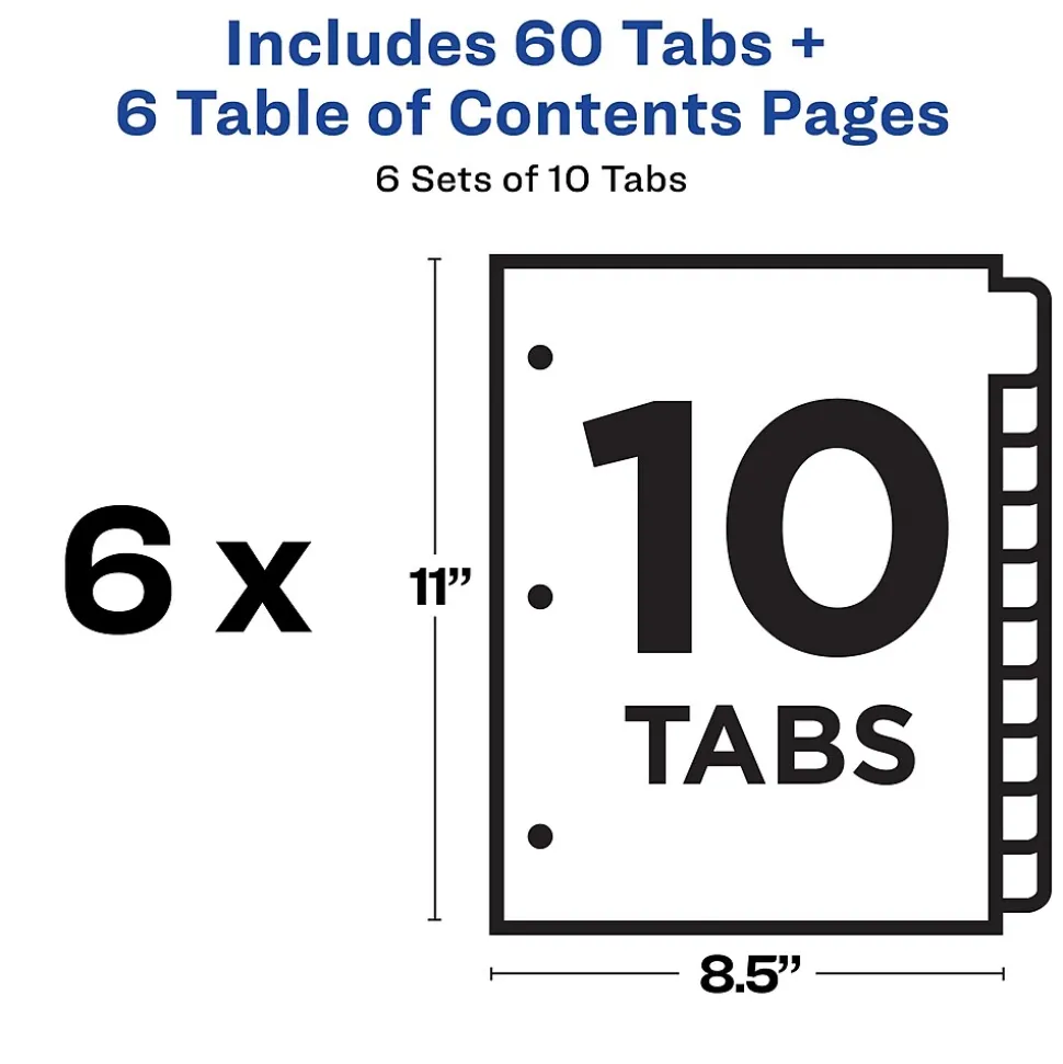 - 6 sets of 10 dividers are included with sturdy tab and hole reinforcements on both sides
