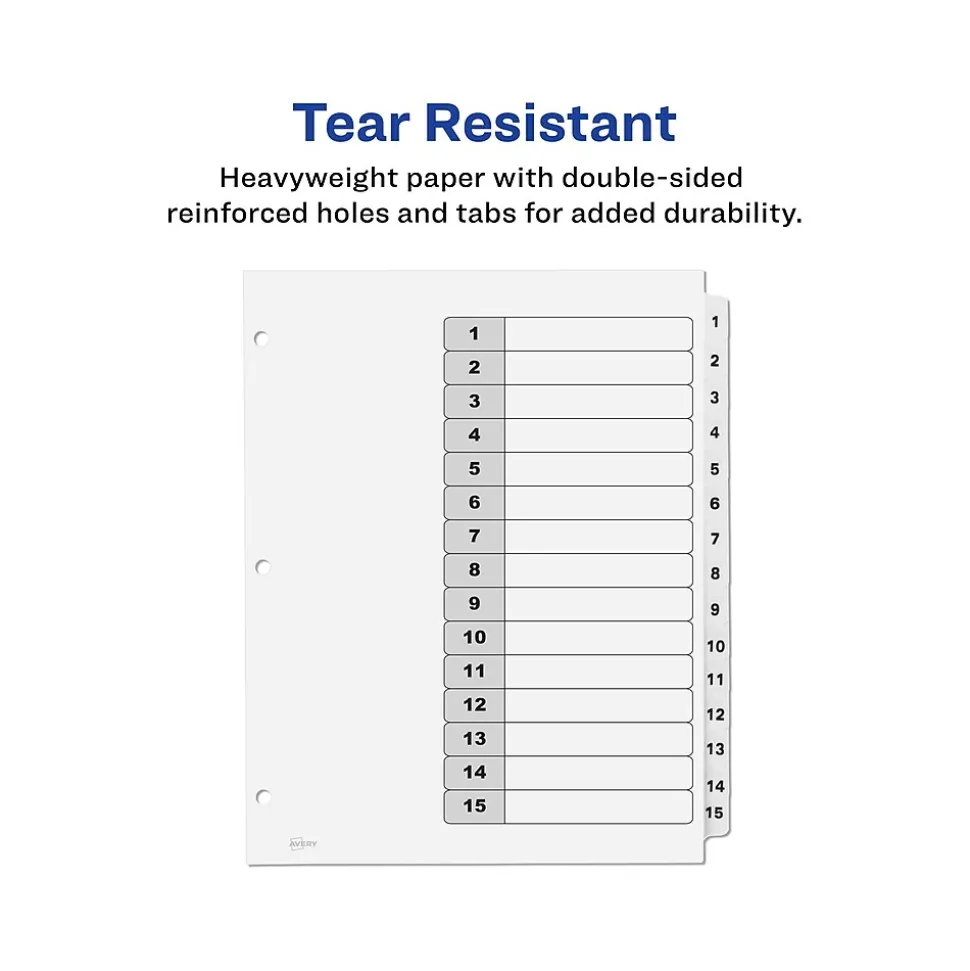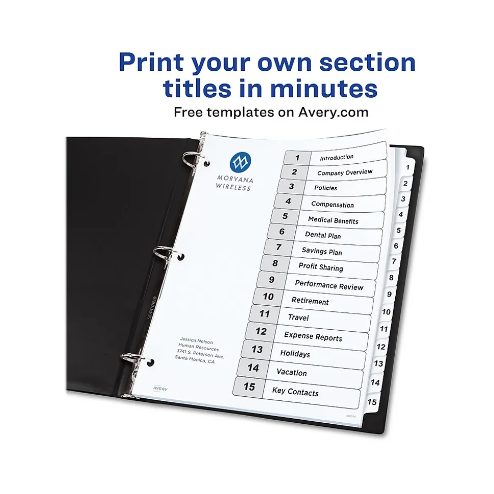 Organize your projects in moments with Avery Ready Index binder dividers. Each white tab is preprinted for a professional appearance. Print your own custom section titles and images onto the table of contents sheet without worrying about labels or inserts. Whether you’re creating planners for classes or hosting a presentation, these dividers are ideal for getting everything sorted.6 sets of 12 dividers are included with each sheet measuring 8-1/2″x11″. The 3 binder holes are reinforced on both sides of the heavyweight sheet to prevent creasing and tearing. Each divider tab includes additional reinforcement along the edge of each page to distribute stress and resist folding.The printable table of contents is dual compatible with both laser and inkjet printers. This sheet can also be printed in either portrait or landscape so that your projects can be displayed in any orientation. Just flip the sheet to view the other layout on the opposite side. Try out free templates for these dividers and check out the Avery Design & Print software at avery.com/templates