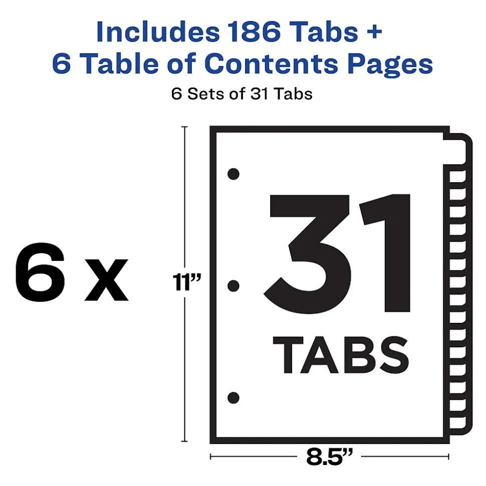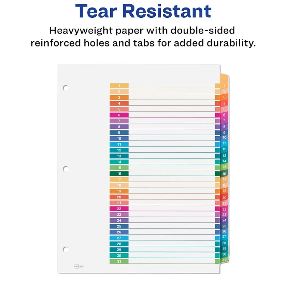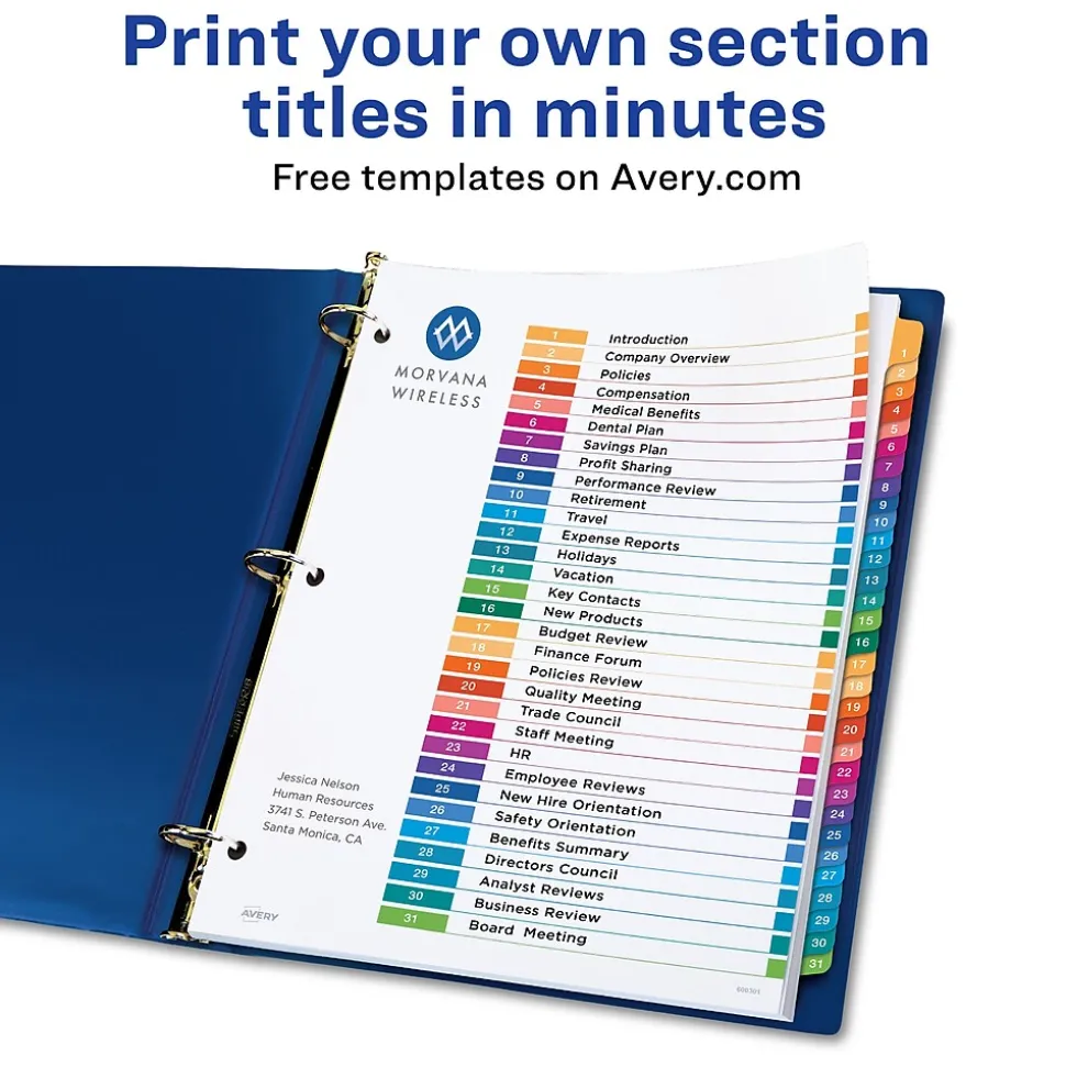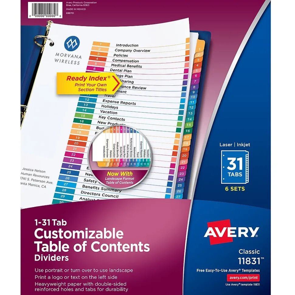 Organize your projects in moments with Avery Ready Index 12-tab monthly dividers. Each tab is preprinted and uniquely color coded for a professional appearance. Print your own custom section titles and images onto the table of contents sheet without worrying about labels or inserts. Whether you’re creating planners for classes or hosting a presentation, these dividers are ideal for getting everything sorted.6 sets of 12 tabbed dividers are included with each sheet measuring 8-1/2″x11″. The 3 binder holes are reinforced on both sides of the heavyweight sheet to prevent creasing and tearing. Each divider tab includes additional reinforcement along the edge of each page to distribute stress and resist folding.The printable table of contents is dual compatible with both laser and inkjet printers. This sheet can also be printed in either portrait or landscape so that your projects can be displayed in any orientation. Just flip the sheet to view the other layout on the opposite side.Try out free templates for these dividers and check out the Avery Design & Print software at avery.com/templates.