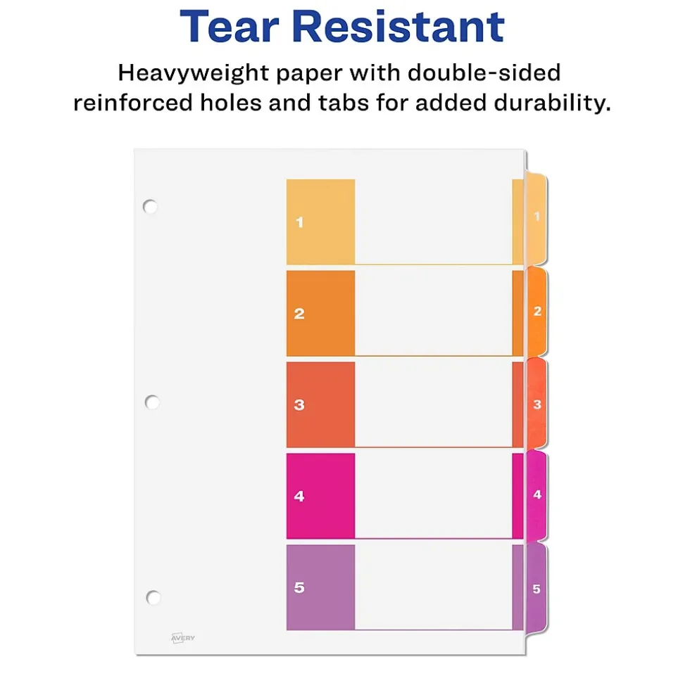 Organize your projects in moments with Avery Ready Index 5-tab dividers.Each tab is preprinted and uniquely color coded for a professional appearance. Print your own custom section titles and images onto the table of contents sheet without worrying about labels or inserts. Whether you’re creating planners for classes or hosting a presentation, these dividers are ideal for getting everything sorted.24 sets of 5 tabbed dividers are included with each sheet measuring 8-1/2″x11″.The 3 binder holes are reinforced on both sides of the heavyweight sheet to prevent creasing and tearing. Each divider tab includes additional reinforcement along the edge of each page to distribute stress and resist folding.The printable table of contents is dual compatible with both laser and inkjet printers. This sheet can also be printed in either portrait or landscape so that your projects can be displayed in any orientation. Just flip the sheet to view the other layout on the opposite side. Try out free templates for these dividers and check out the Avery Design & Print software at avery.com/templates.