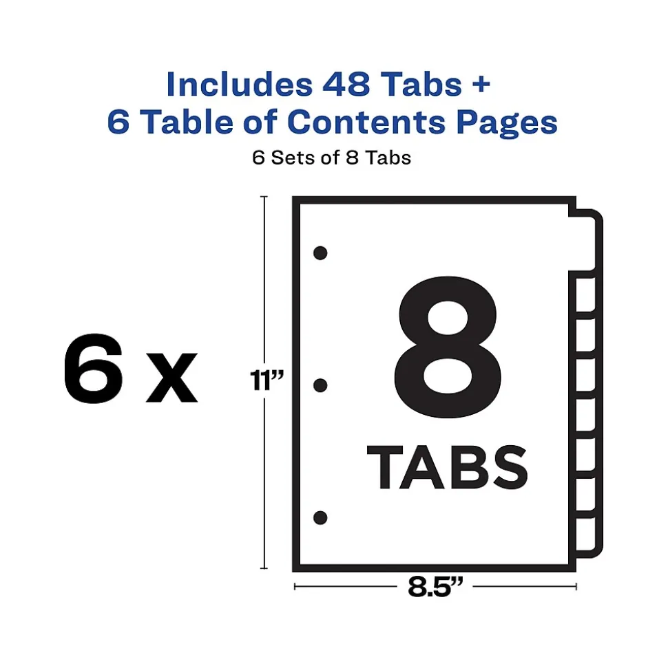 Organize your projects in moments with Avery Ready Index A-Z dividers.Each tab is preprinted and uniquely color coded for a professional appearance. Print your own custom section titles and images onto the table of contents sheet without worrying about labels or inserts. Whether you’re creating planners for classes or hosting a presentation, these dividers are ideal for getting everything sorted.6 sets of 26 alphabet dividers are included with each sheet measuring 8-1/2″x11″. The 3 binder holes are reinforced on both sides of the heavyweight sheet to prevent creasing and tearing. Each divider tab includes additional reinforcement along the edge of each page to distribute stress and resist folding.The printable table of contents is dual compatible with both laser and inkjet printers. This sheet can also be printed in either portrait or landscape so that your projects can be displayed in any orientation. Just flip the sheet to view the other layout on the opposite side. Try out free templates for these dividers and check out the Avery Design & Print software at avery.com/templates.