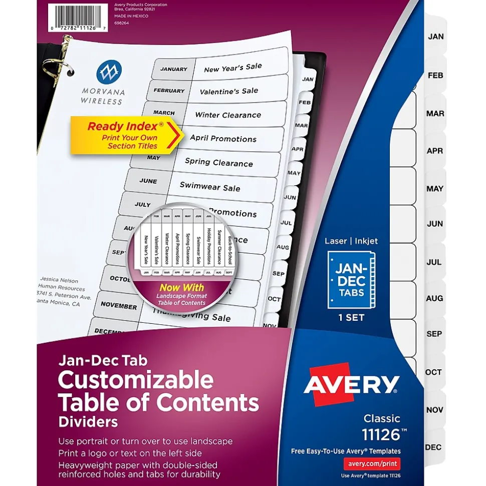 Organize your projects in moments with Avery Ready Index binder dividers. Each Jan-Dec white tab is preprinted for a professional appearance. Print your own custom section titles and images onto the table of contents sheet without worrying about labels or inserts. Whether you’re creating planners for classes or hosting a presentation, these dividers are ideal for getting everything sorted.1 set of 12 dividers are included with each sheet measuring 8-1/2″x11″.The 3 binder holes are reinforced on both sides of the heavyweight sheet to prevent creasing and tearing. Each monthly divider tab includes additional reinforcement along the edge of each page to distribute stress and resist folding.The printable table of contents is dual compatible with both laser and inkjet printers. This sheet can also be printed in either portrait or landscape so that your projects can be displayed in any orientation. Just flip the sheet to view the other layout on the opposite side. Try out free templates for these dividers and check out the Avery Design & Print software at avery.com/templates.