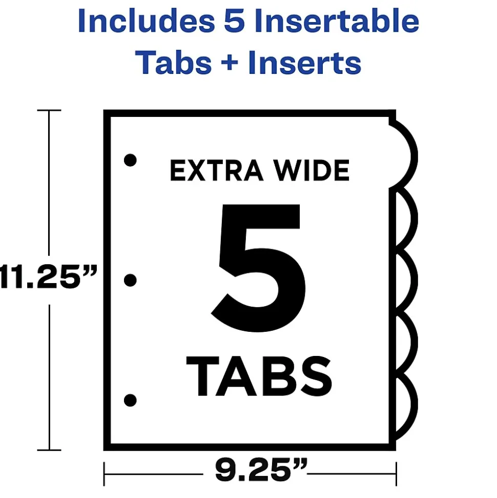 - Store loose papers and unpunched sheets within the front pocket of each 5-tab binder dividers