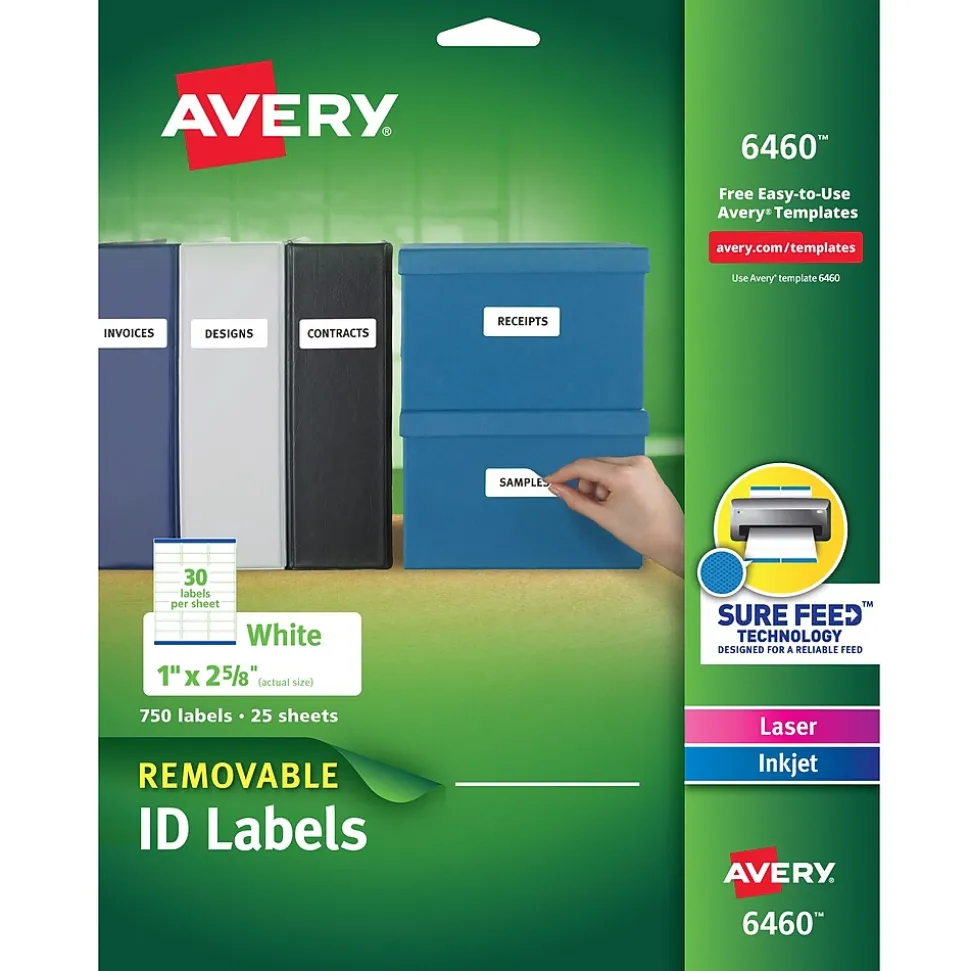 Organize your home, office or classroom by labeling items for easy identification. This multiuse label adheres to a variety of smooth surfaces, including paper, cardboard, plastic, wood, glass and metal. Removable labels stick and stay, yet remove cleanly as needed. Printable ID labels are engineered with Sure Feed(R) technology for a reliable feed through your printer, preventing jams and misalignments—and that means no more wasted labels. Identify contents of containers, bins, drawers and shelves; mark property with ID labels for equipment or ID labels for electronics; create kids ID labels to tag belongings; personalize gifts and party favors; and use them as pricing labels or on your packaging. Customize your labels with free designs and templates at avery.com/templates and attach to supplies, containers, documents and more.