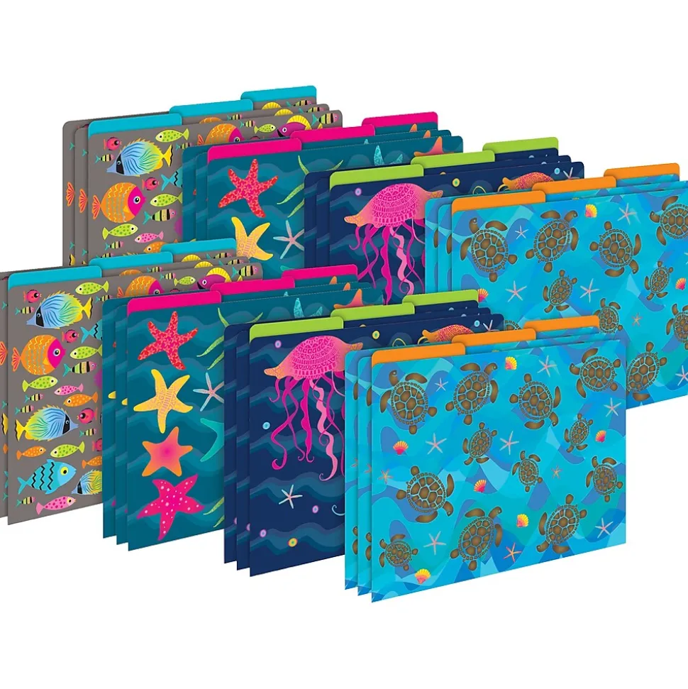 Barker Creek’s Kai Ola Letter-Sized File Folders are an affordable way to organize your office, classroom, and home with style and flair. This set includes 24 file folders – six each of four beautiful designs. The first set of six folders features sea turtles with shells and starfish on a beautiful aqua blue background on the outside of the folder with a tangerine orange interior. The second set of six folders has vibrant colored jellyfish on a lovely navy and blue background on the outside with a lime green interior. The third set of six folders has colorful starfish of various sizes on a lovely blue and aqua background on the outside with a hot pink interior. The fourth set of six folders has beautiful fish of various colors and sizes on a lovely taupe background on the outside with an aqua blue interior. The folders are 1/3 tabbed, which means that they have three tab positions – eight folders are tabbed on the left, eight folders are tabbed in the center, and eight are tabbed on the right. Fully reversible, each folder has a colorful design on one side and a vibrant, solid color on the reverse side – perfect for making file folder games and lapbooks. The 14-point stock makes these folders perfect for desktop filing, meeting handouts, and student papers. The possibilities are limited only by your imagination! Coordinating products available: Search Barker Creek Kai Ola.