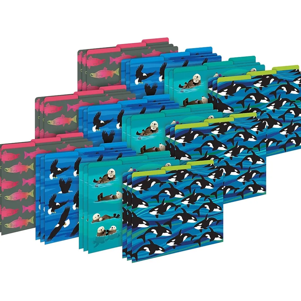 Barker Creek’s Sea & Sky letter-sized file folders are an affordable way to organize your office, classroom, or home with style and flair! The set includes 36 folders – nine each of four beautiful designs. These folders feature orca whales, playful otters, American bald eagles, and sockeye salmon! Coordinating designs are printed on the inside making each folder fully reversible for added value! The tabs are 1/3 cut and the folders are printed on durable 14-point stock. In addition to being great for everyday filing needs, these folders are also perfect for presenting meeting handouts, organizing important papers, sending work home with students, storing treasured photos and archiving other significant mementos. The possibilities are limited only by your imagination! See Barker Creek’s full line of fashion-forward file folders!! Coordinating products available: Search Barker Creek Sea & Sky.