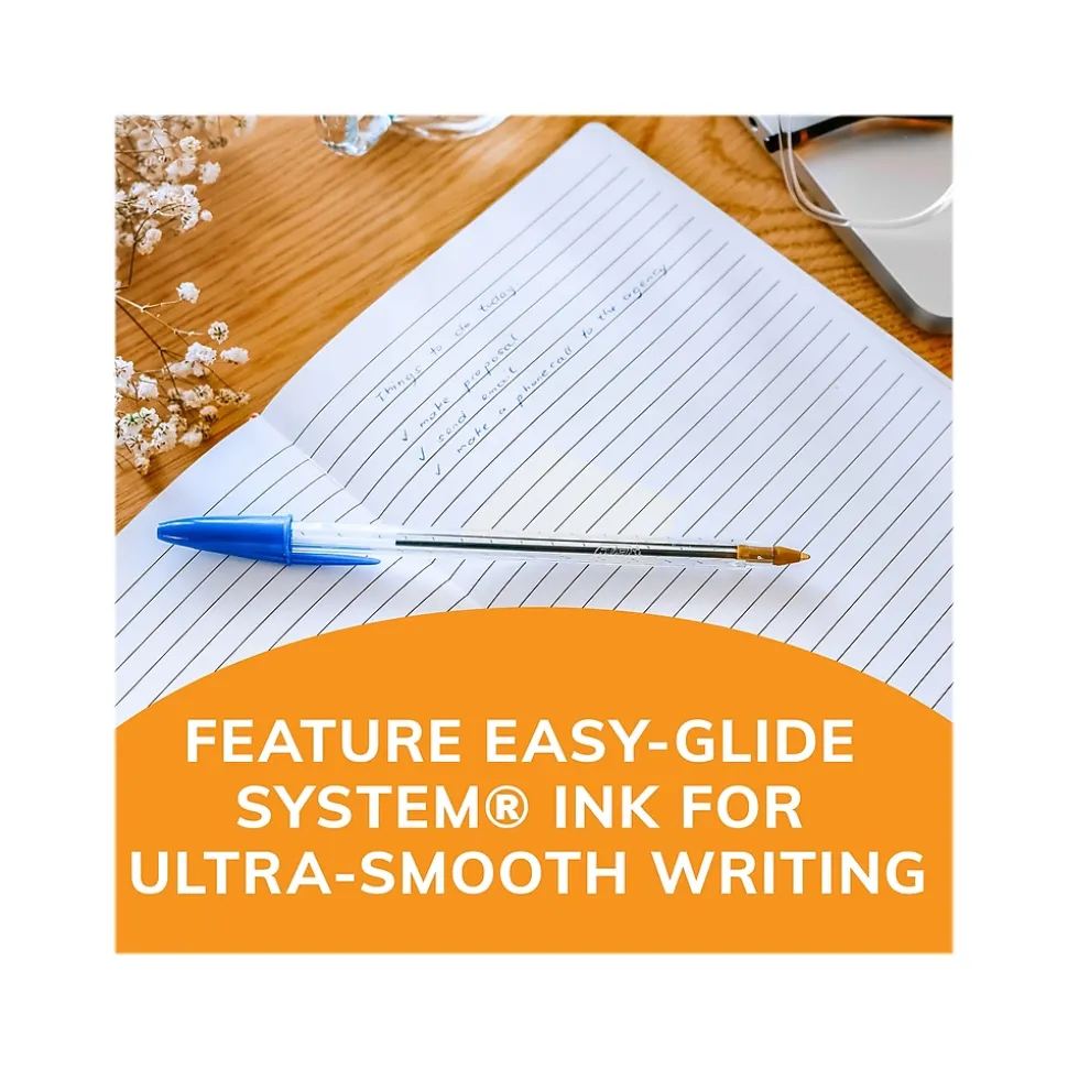 Combine exceptional performance and longevity with the BIC Cristal Xtra Smooth blue ballpoint pen. The flexible 1.0mm medium-point pen delivers crisp, legible lines, making this pen a superb choice for everyday writing activities. The pen minimizes blotting and skipping, as the tungsten carbide ball helps the blue ink spread evenly. The BIC Cristal Xtra Smooth pen has a snug, comfortable grip and a clear hexagonal barrel that lets you see how much ink remains. The matching cap includes a handy clip for easy attachment to pockets or notebooks.
