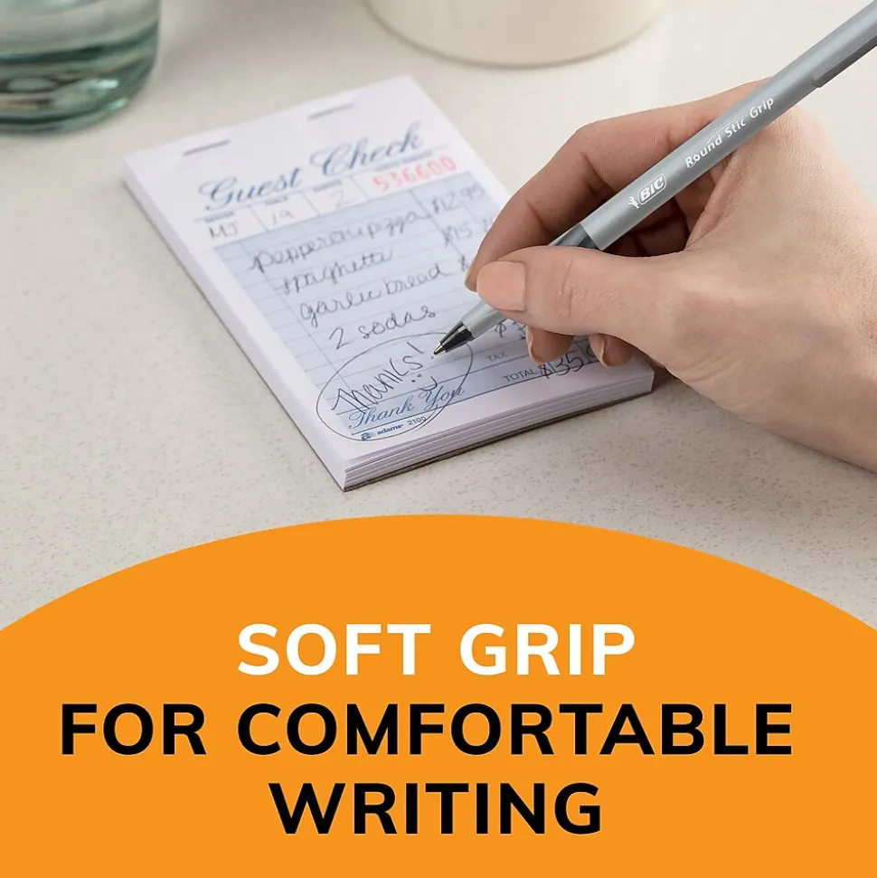 Write lengthy letters, journal entries, and other papers comfortably by using these fine-point pens. Featuring textured finger grips, these pens offer a comfortable hold and increased control when writing, while the 0.8mm fine-point tips provide enhanced precision and accuracy. These BIC Round Stic Grip Xtra Comfort black ballpoint pens come with 12 to a pack, making it easy to stock up the office, home, or classroom.