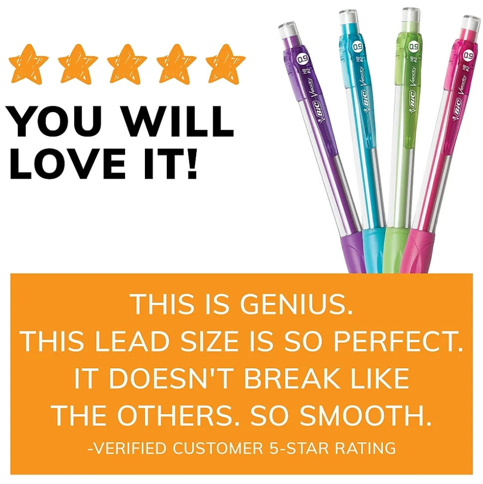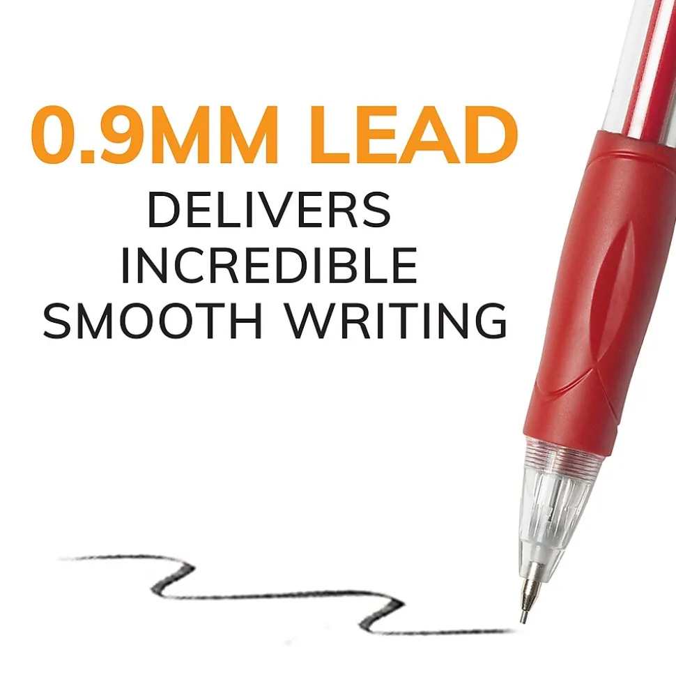 These 0.9mm mechanical pencils have a thick point that’s ideal for a variety of everyday writing activities. The strong lead doesn’t smudge and erases cleanly, so your work looks neat and professional. Convenient and reliable, BIC Velocity Number 2 Mechanical Pencils 0.9 mm are always ready and never need sharpening; to advance the pencil lead, simply click the built-in eraser. These Bic mechanical pencils have a sophisticated, modern look, and their colorful clips easily attach to pockets, notebooks and more. The No. 1 selling mechanical pencil brand in the United States*, BIC offers dependable performance and value that you can trust. Looking for larger quantities of school or office supplies? Choose BIC Mechanical Pencils With Erasers for a high-quality, safe and affordable product you can trust. *Source: The NPD Group/Retail Tracking Service and Commercial Tracking Service, U.S., based on actual unit sales, 12ME June 2022 combined.
