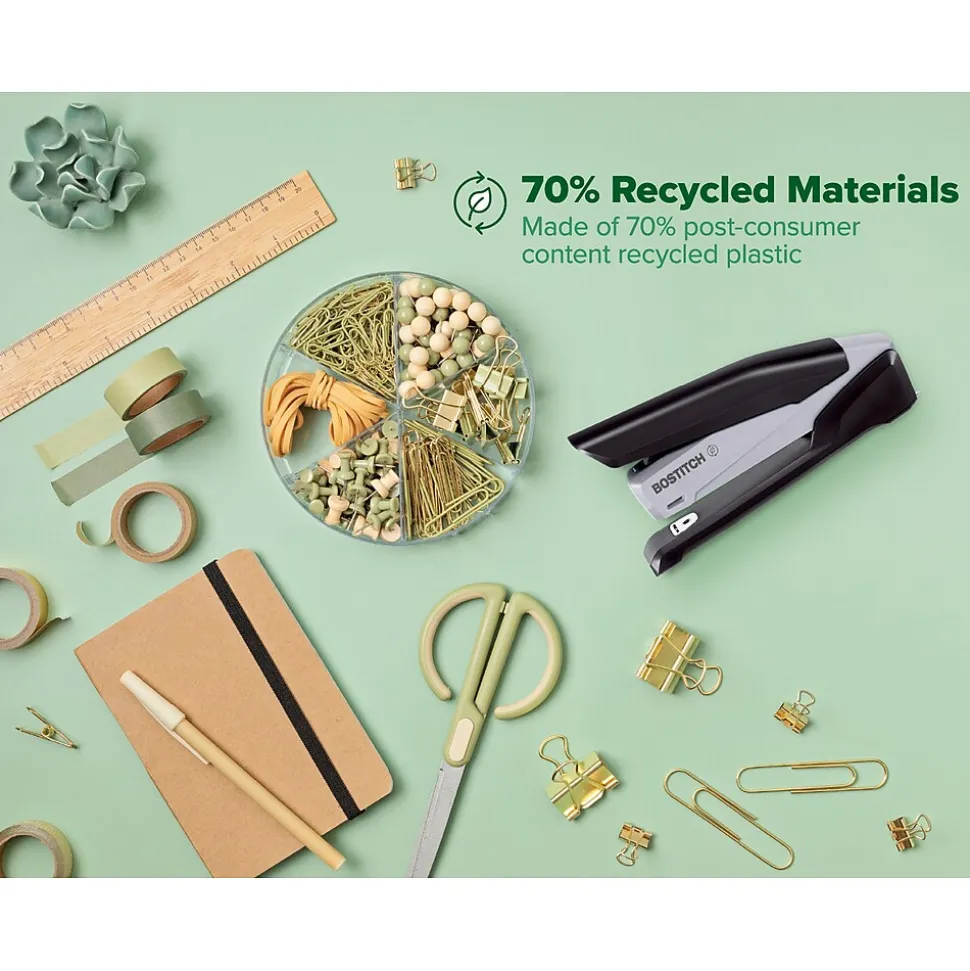 Bostitch inPower™ Eco-Friendly Stapler: Effortlessly bind documents with One-Finger Stapling Technology, crafted from 70% post-consumer recycled plastic. This sleek, durable stapler handles up to 25 sheets, reducing hand strain with its ergonomic design. Enjoy jam-free operation with standard staples and utilize it for bulletin board tacking, perfect for any workspace at home, school, or the office.