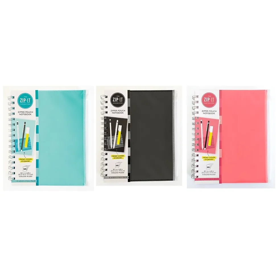 The Carolina Pad Zip-It notebook features a slide zipper front pocket cover. Perfect for storing small notes, business cards, USB drives, etc. The notebook measures 8.75” x 7”, making it the perfect size for school and work. There are 120 college-ruled perforated sheets and two interior dividers. The front cover is durable poly and the back is heavy-duty board. The binding consists of twin nylon-coated wire.