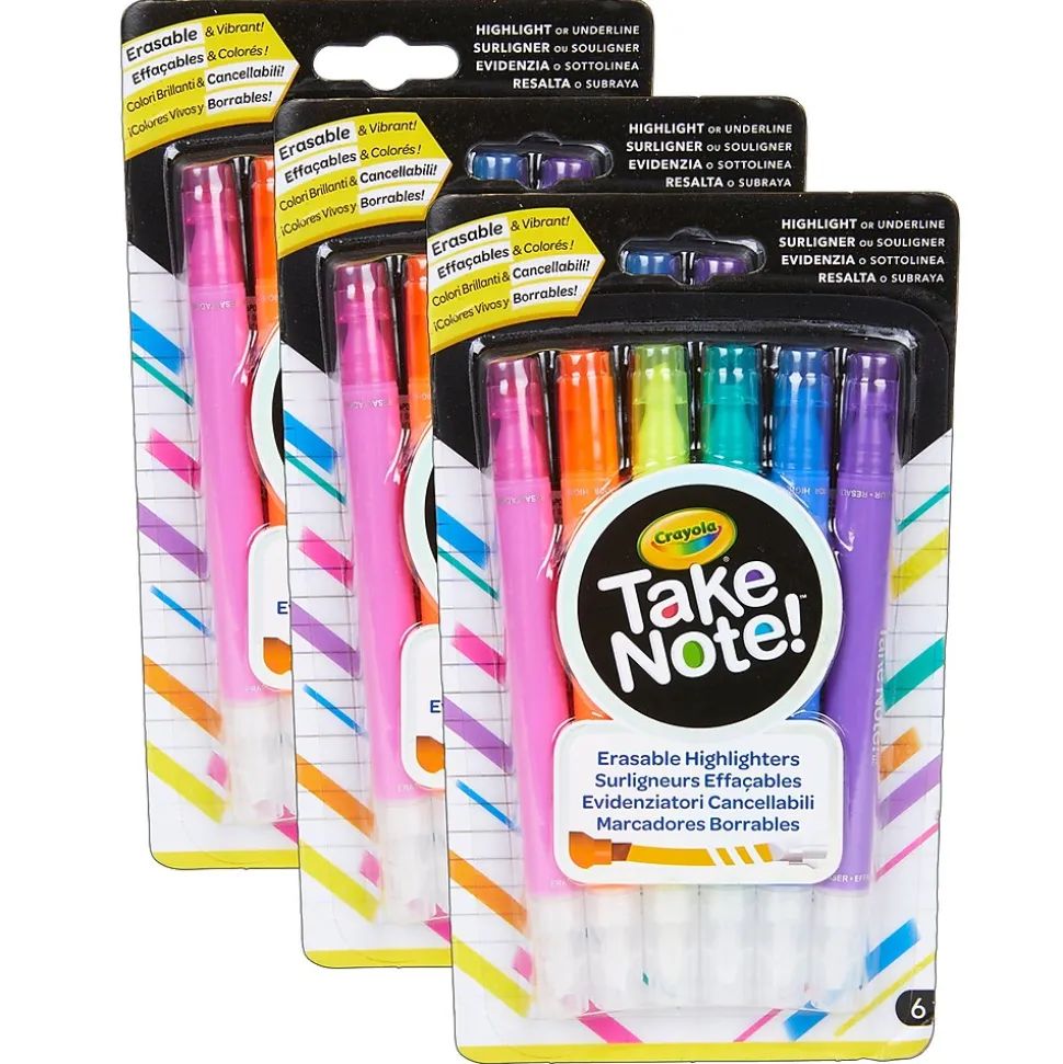 Highlight and erase in 6 vibrant colors—without damaging books or documents! The Crayola® Take Note! erasable highlighters have bright colors on one end, with clear ink tips on the other end for magically erasing the colorful highlights. No more worrying about highlighting the wrong word or over-highlighting a page! For 6 years and up. Each pack includes 6 dual-tipped erasable highlighter markers in 6 different colors. Sold as 3 packs for a total of 18 highlighters.