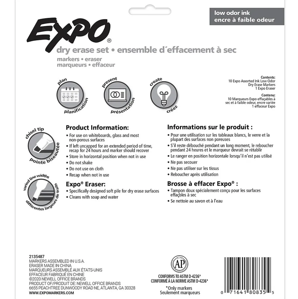 The Expo low-odor dry-erase marker Starter Set has everything you need to get started working on your whiteboard. The set includes an eraser and 10 whiteboard chisel-tip markers in assorted colors. The whiteboard markers feature bold ink that’s easy to see from a distance and provides consistent color quality. The dry-erase marker ink is specially formulated to be low-odor, making it perfect for use in classrooms, offices, and homes. Use your colorful Expo dry-erase marker kit to track, schedule, and present.