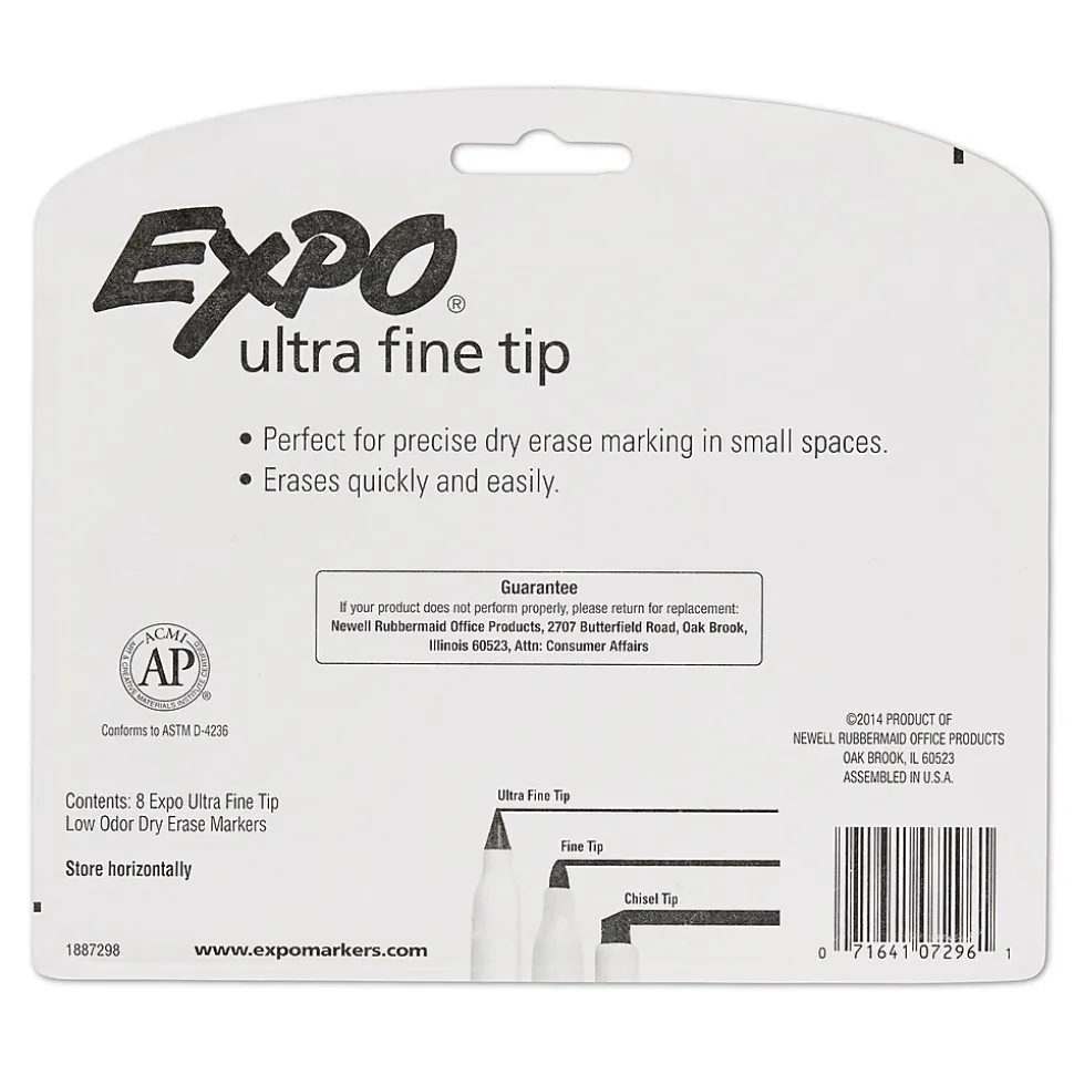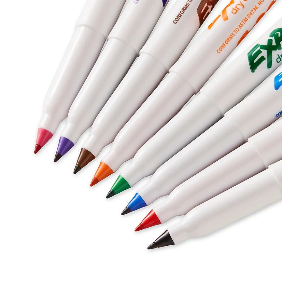Create precise, erasable lines with these EXPO low-odor dry-erase markers. The quick-drying ink helps reduce smearing, while the visible ink supply ensures you don’t run out without warning. The durable ultra-fine-point tip lets you make precise marks on most hard surfaces. These EXPO low-odor dry-erase markers come in a pack with eight colors for bright presentations.