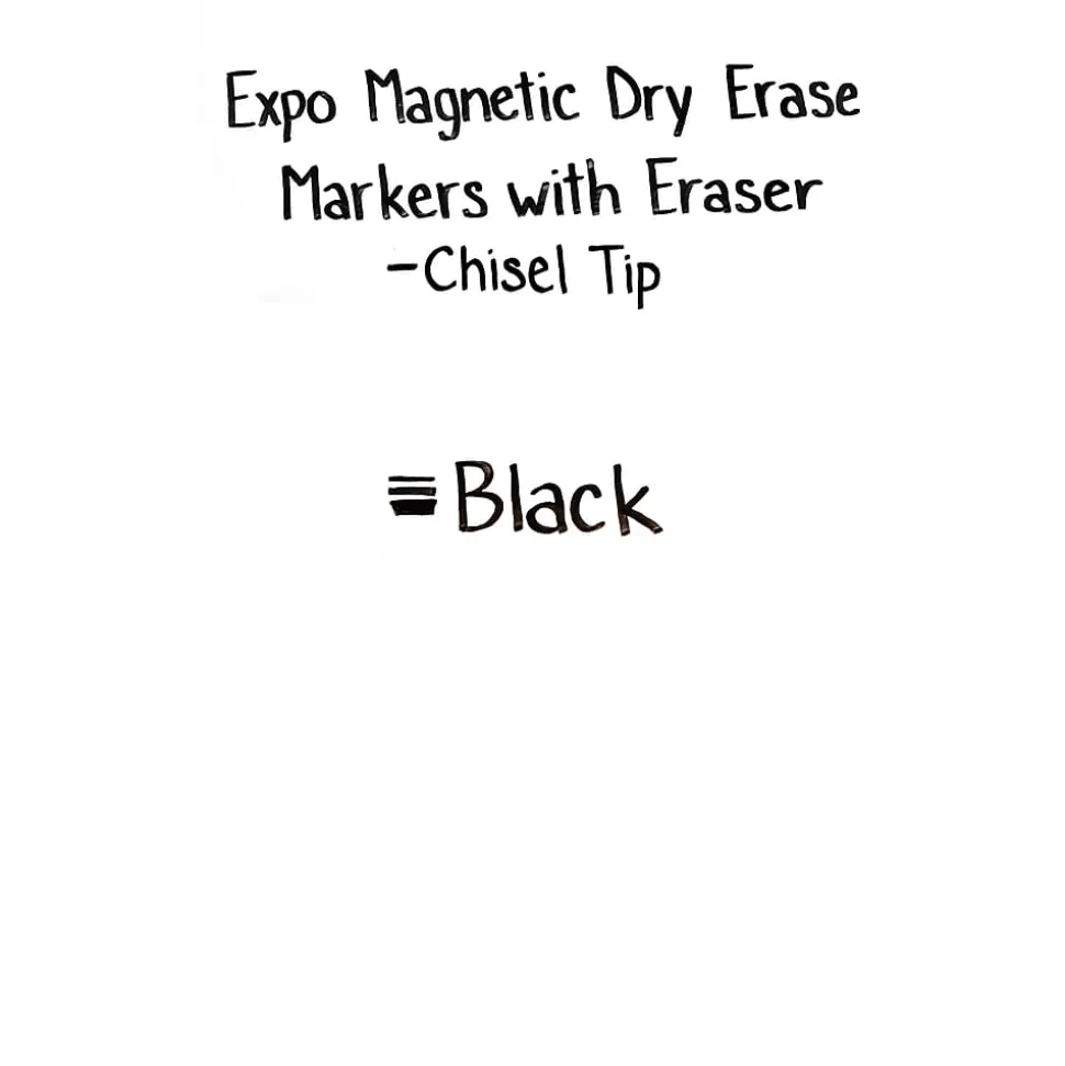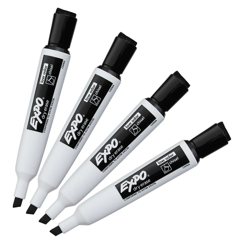 Draw diagrams or design presentations with this 4-count pack of EXPO back dry-erase markers. The chisel tip lets you create wide or thin lines, and integrated magnets stick each pen to any metal surface for easy storage. These low-odor markers are ideal for enclosed spaces like classrooms and offices. The black ink dries quickly, and the dark, intense color is easy to see from the back of the room.
