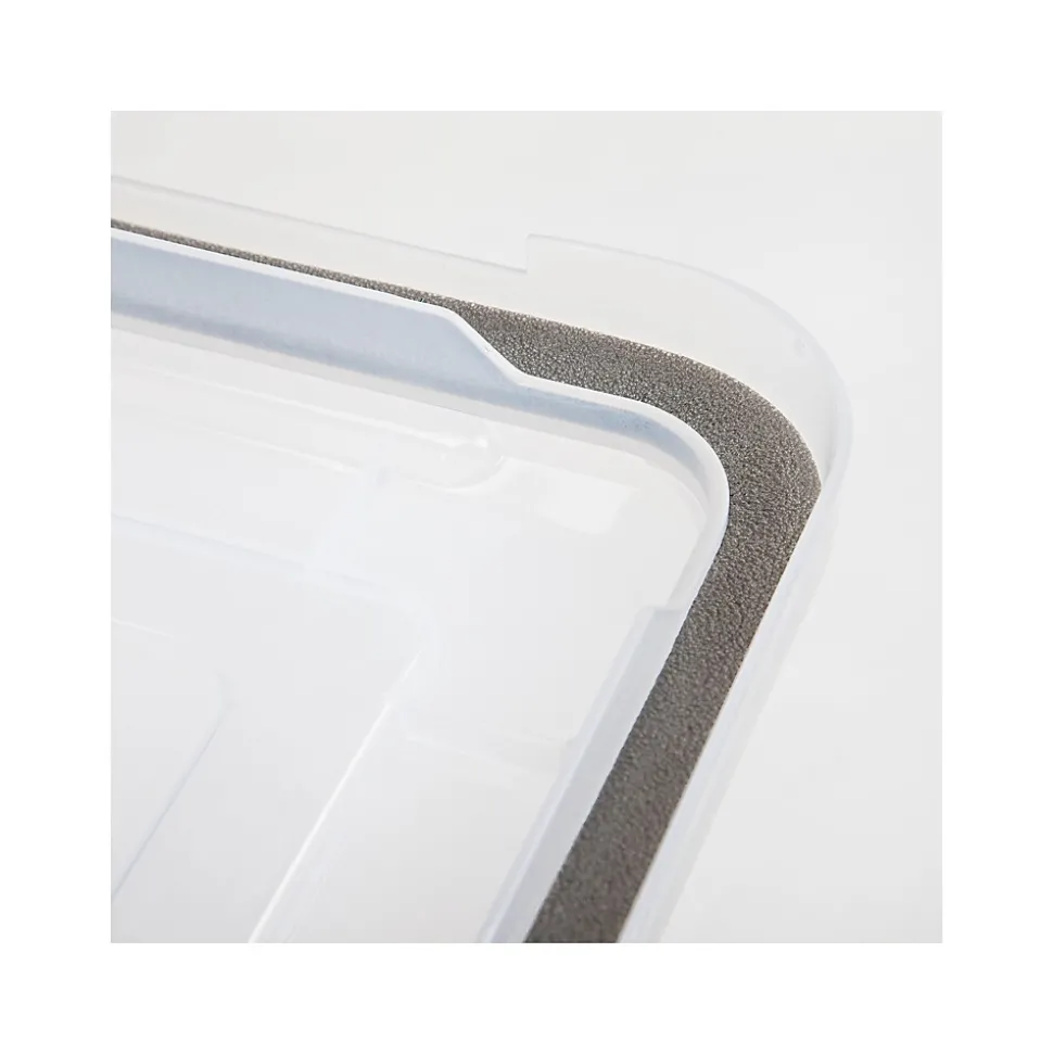 Protect important paperwork from dirt, dust, and water damage when you secure it in these storage boxes. The snap closures keep the lids securely in place, and the stacking design conserves space in file rooms or closets. Each bin features a foam seal to help keep moisture away from documents.