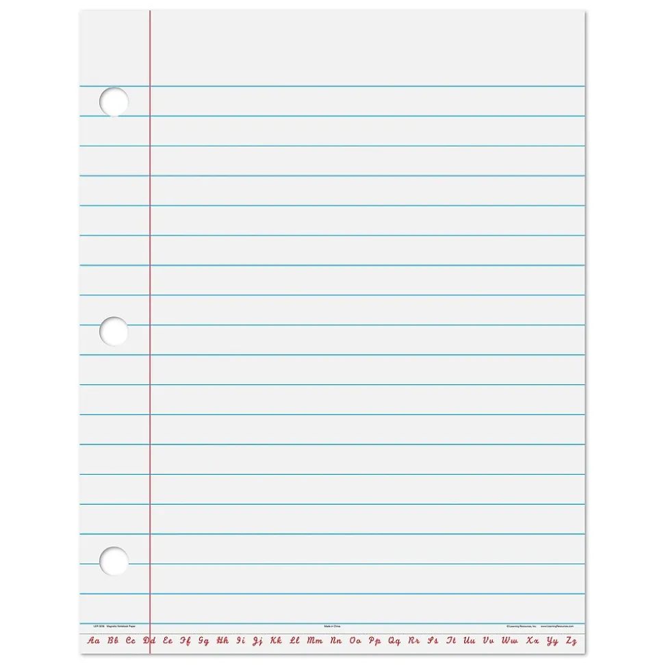 Learning Resources® Magnetic notebook paper has durable write on/wipe off surface that works with wet erase markers and measures 28″ x 22″. Notebook paper sticks firmly to magnetic boards and is used model sentences, letters or note takings.