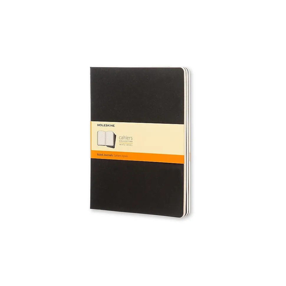 Jot down lists, ideas, and other notes with these extra-large black soft cover ruled journals. The soft covers and compact size make it easy to store these journals in a purse or backpack, while the black coloring adds a sophisticated appearance. These Moleskine Cahier soft cover journals come in a set of three and have lightly printed ruling to guide writing while ensuring words stand out for easy readability.