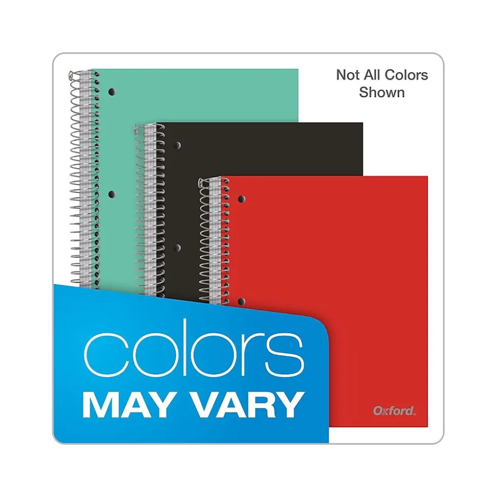This Oxford five-subject poly notebook comes in bright colors and is three-hole punched to fit a standard binder. Includes five poly divider pockets and a strong no-snag coil. Comes in assorted colors.
