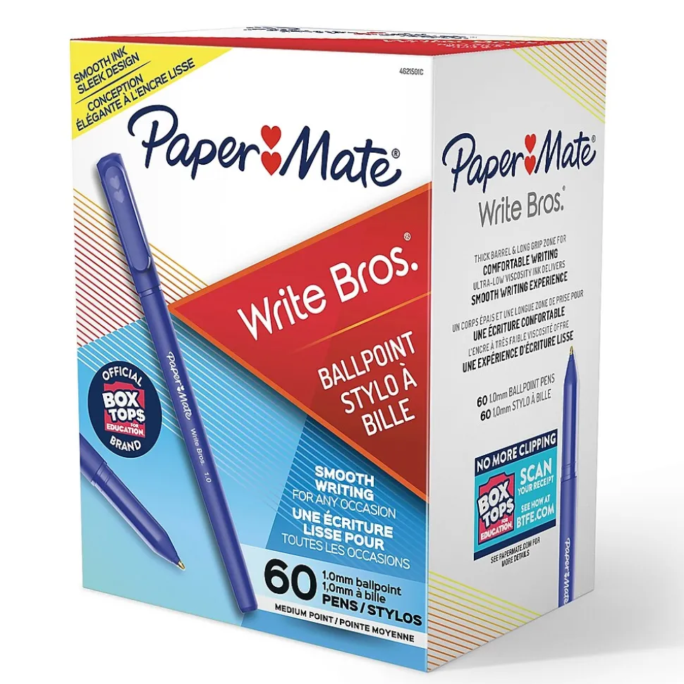 Paper Mate Write Bros medium-point ballpoint stick pens with blue ink make notetaking simpler thanks to lightweight, no-nonsense construction, smooth ink delivery and steady lines. The tops fit securely onto each end of the pen and the clip lets you keep pens handy in your pocket, portfolio or folder.