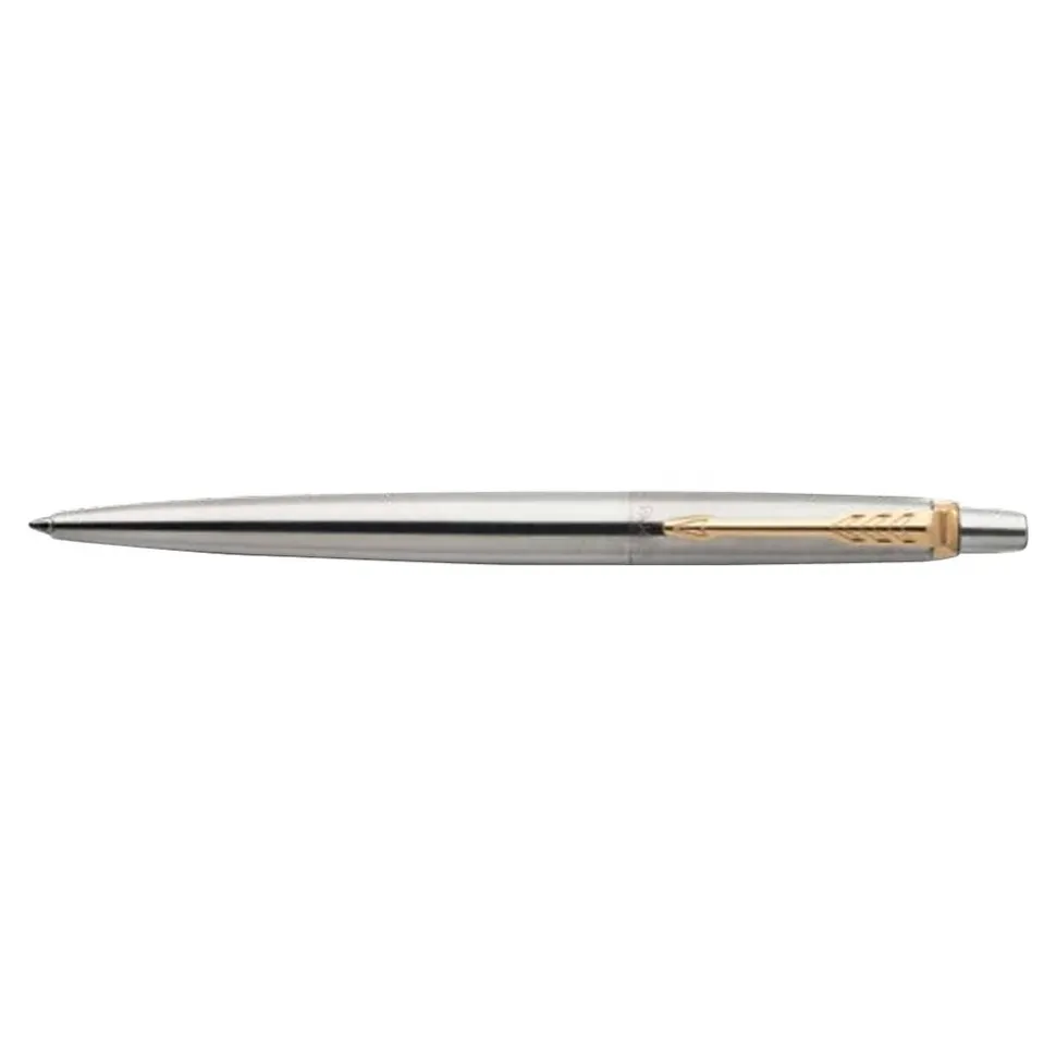 Create easy-to-read messages for members of your team with this black ink pen. The 0.7mm medium-point size delivers your ideas in bold black ink that resists fading, while the retractable design makes this pen easy to use with a simple click. This refillable Parker Jotter rollerball black ink pen is made of stainless steel with a gold trim barrel for a firm grip and a pocket clip for convenient carrying.