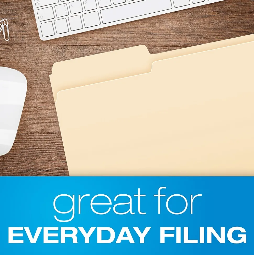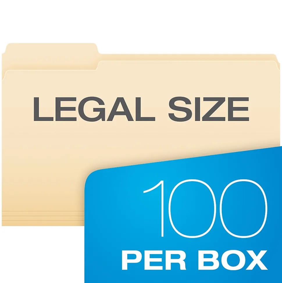 Pendaflex File Folders are perfect for everyday filing needs. Our standard Manila folders stand up to the daily grind. Legal size, 1/3-cut tabs in left position. 100 Per box.