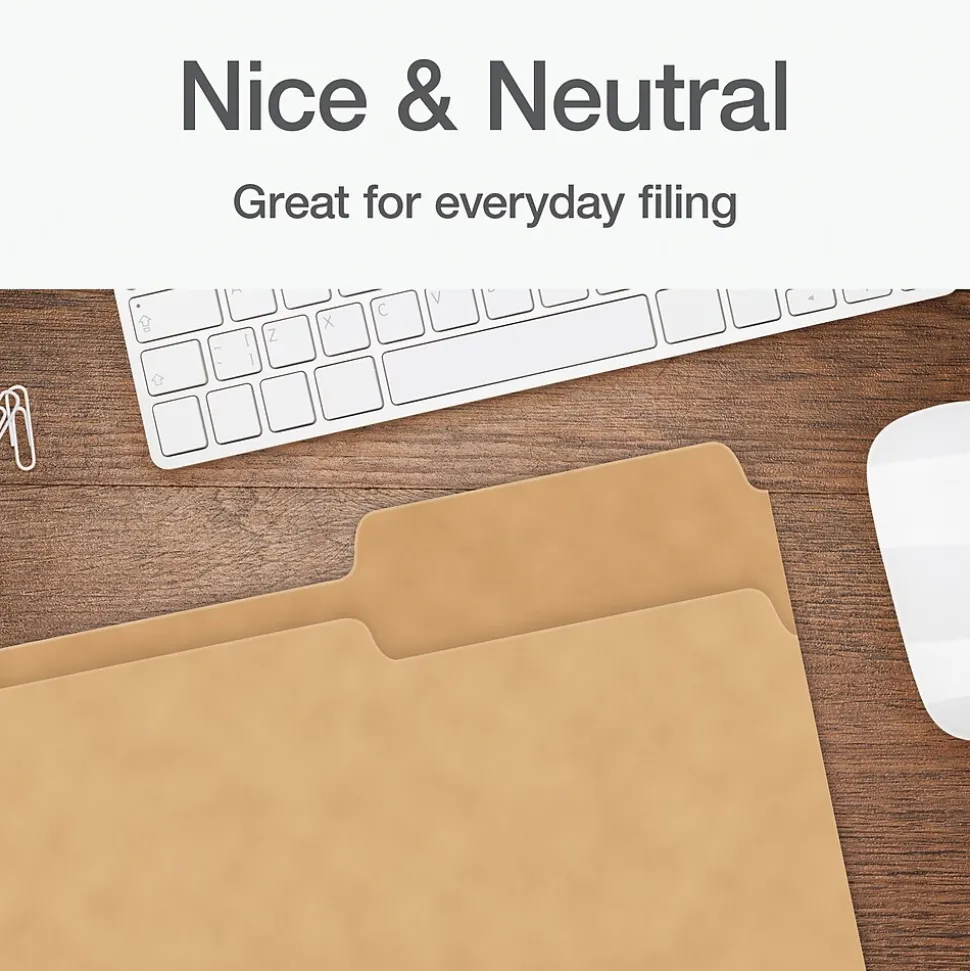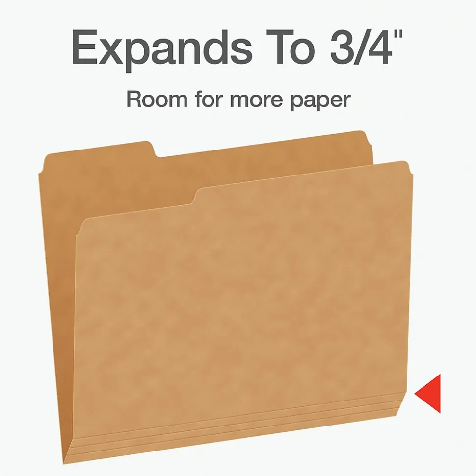 These Pendaflex File Folders are made from heavyweight 14 pt. paper to better withstand wear and tear. They come in a nice, neutral Kraft to match any home or office aesthetic. The 1/3 cut tabs come in 3 different positions (left, right, center), so you can see all of your labeled tabs in a file box or file drawer. Each folder fits letter-sized papers and is scored along the bottom for 3/4 inch expansion. Box of 50 Kraft file folders.