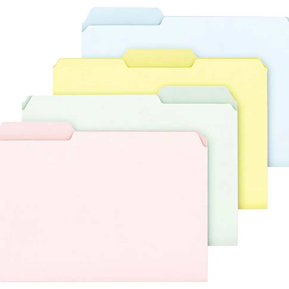 Lighter interior prevents misfiles. 11 pt. paper. Paper made from 10% recycled fiber with 10% post-consumer fiber. Assorted Pastel colors.