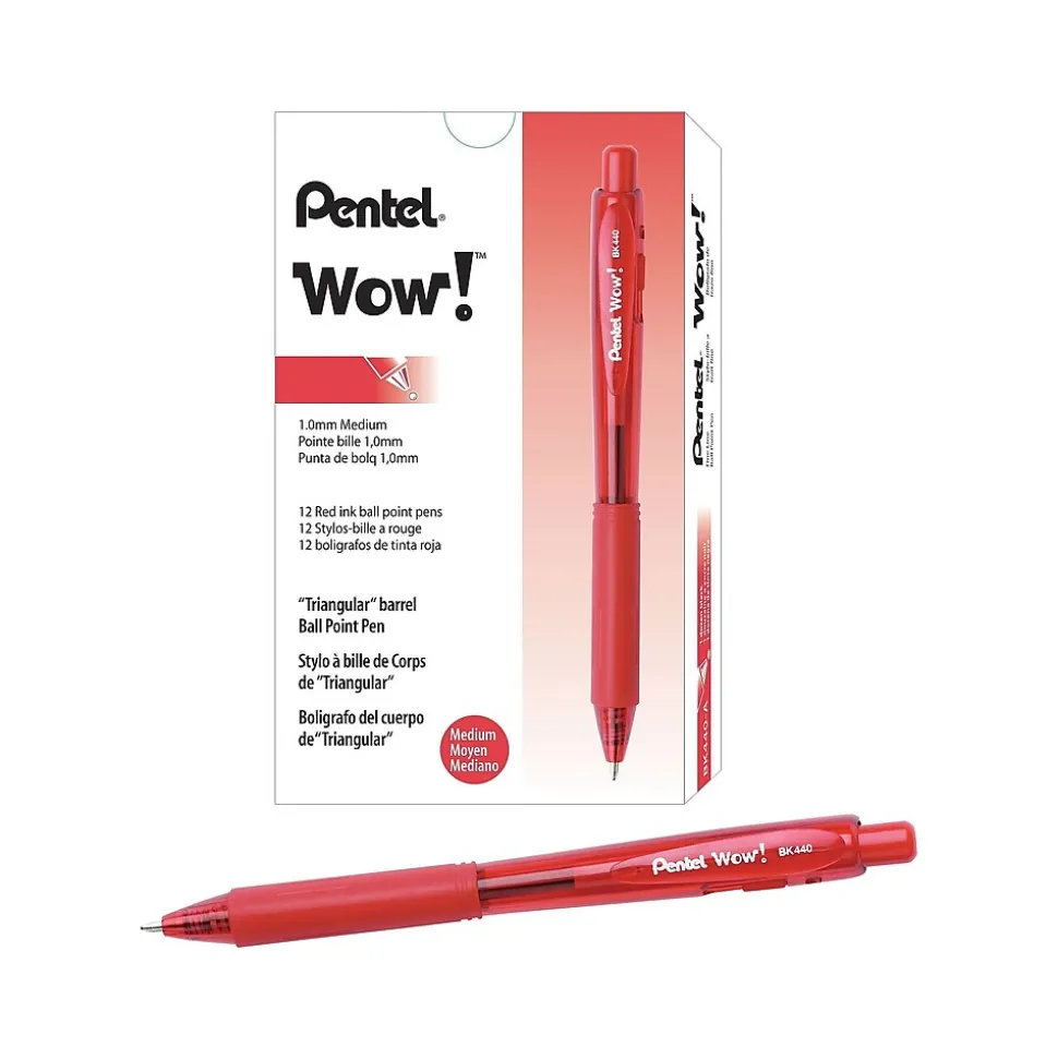 Write grade homework or edit documents with these retractable red ballpoint pens. With a triangular barrel construction, these pens resist rolling off desks, tables, and other hard surfaces. These Pentel WOW! medium ballpoint pens feature red ink color, making them ideal for easily readable text that lets important notes stand out, while the latex-free grip provides a comfortable writing experience.